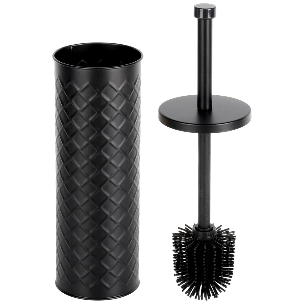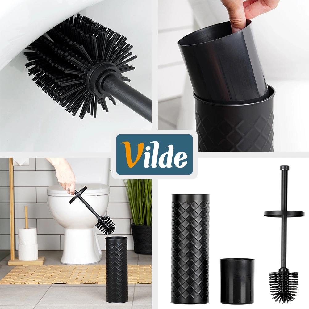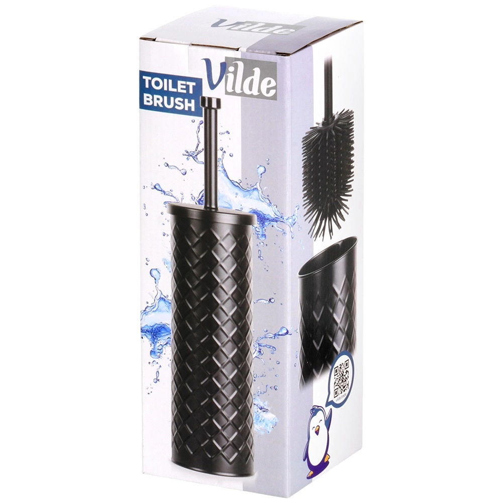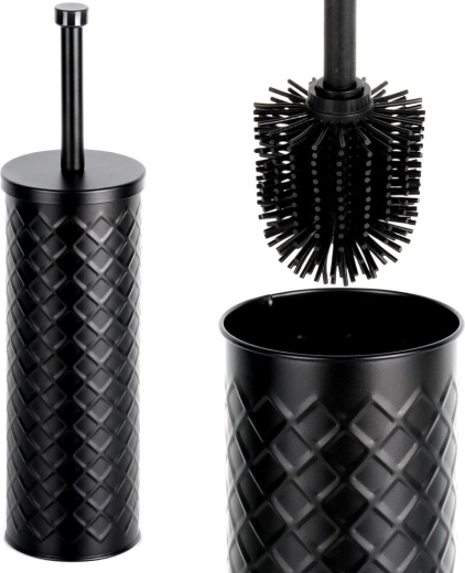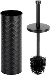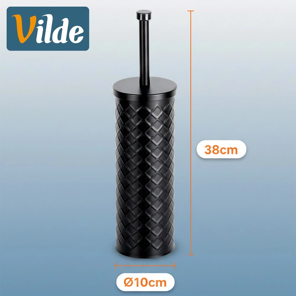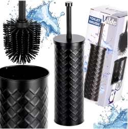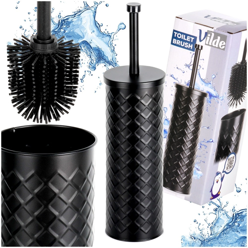 Elegantná silikónová WC kefka s kovovým stojanom v matnej čiernej farbe pre hygienickú a nenápadnú údržbu toalety. Uzavretý držiak s odkvapkávačom zabezpečuje čisté a suché odkladanie, silikónová hlavica sa ľahko oplachuje a nenasáva nečistoty. Stabilný kovový zásobník s reliéfnym vzorom a pohodlná dlhá rukoväť pre hygienické čistenie. Klasický a moderný dizajn skvele zapadne do každej kúpeľne.