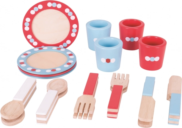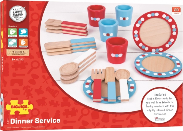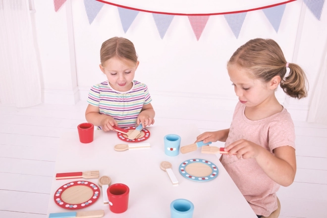 Táto farebná drevená jedálenská súprava je navrhnutá pre začínajúcich mladých kuchárov, ktorí chcú pripraviť vlastné večere a usporiadať čajové posedenia. Skvelý doplnok každej drevenej kuchynky na hranie, súprava obsahuje: