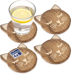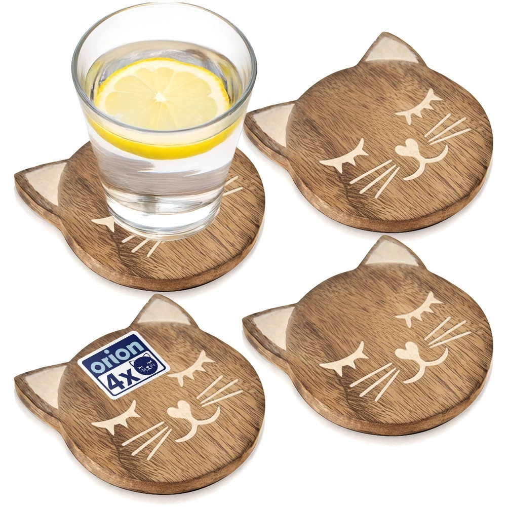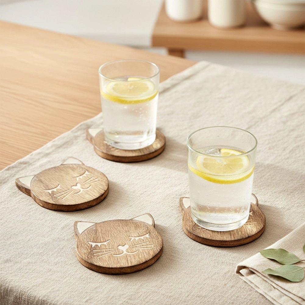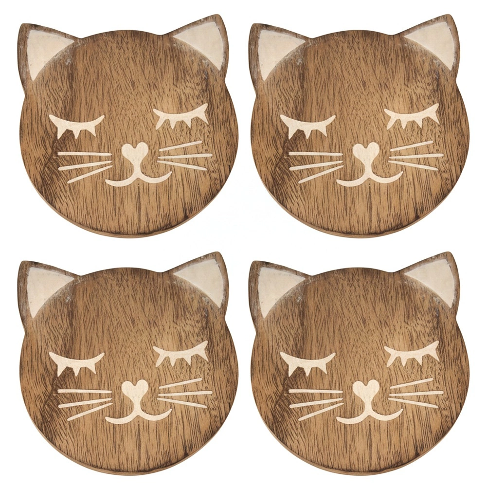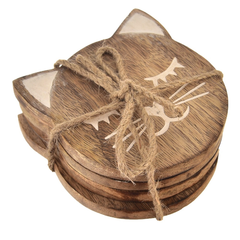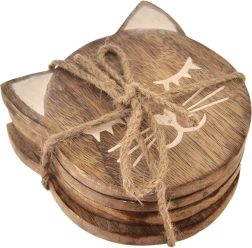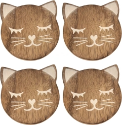 Roztomilá sada štyroch podtáckov z mangového dreva s motívom mačacej hlavičky chráni stôl pred teplom aj vlhkosťou a skrášli každý stôl. Prírodné drevo, univerzálne použitie pre hrnčeky, poháre aj šálky a štýlový mačací dizajn z nich robia skvelý doplnok aj tip na darček pre milovníkov mačiek.
