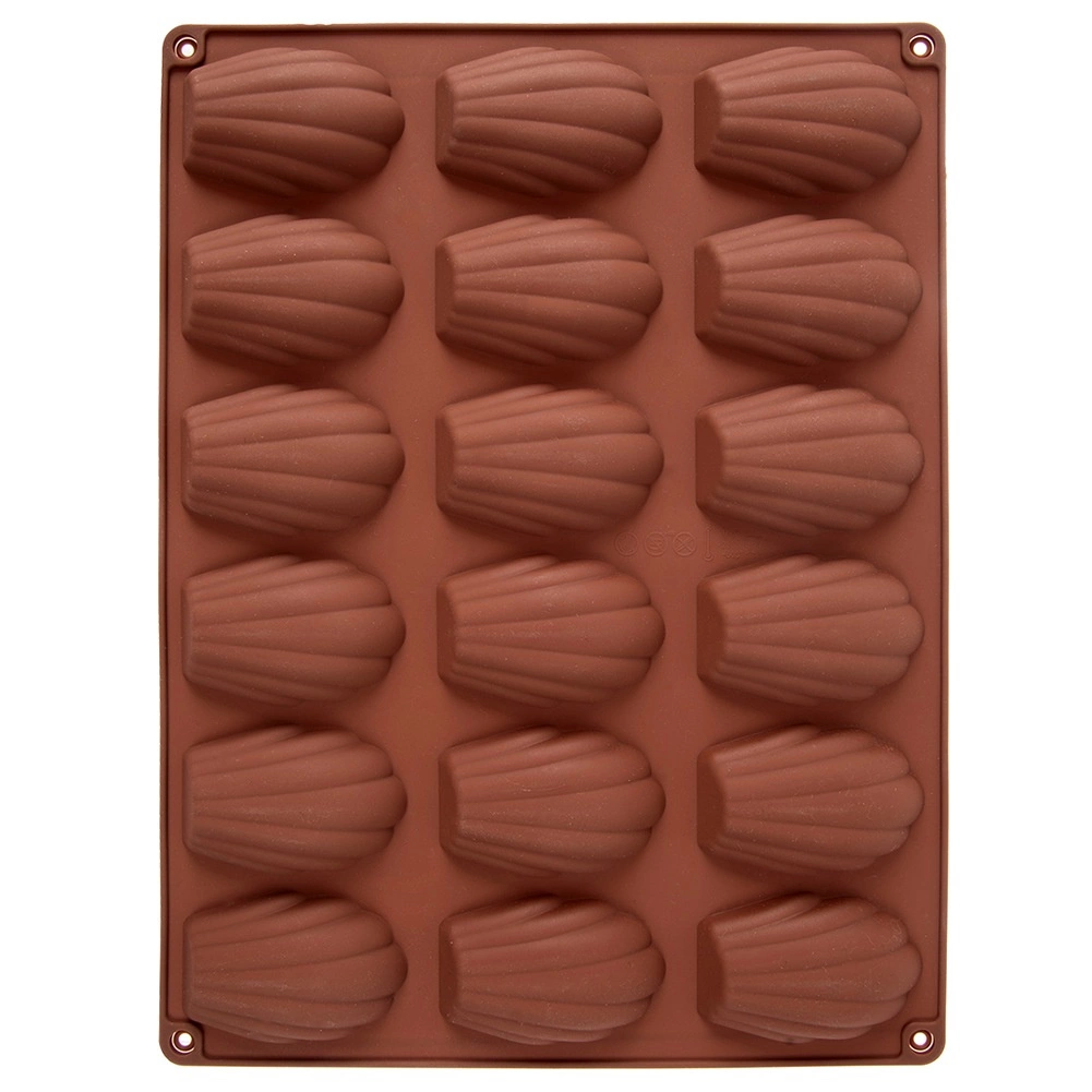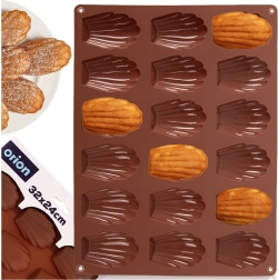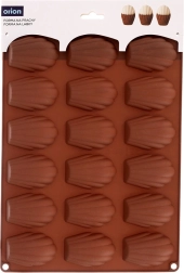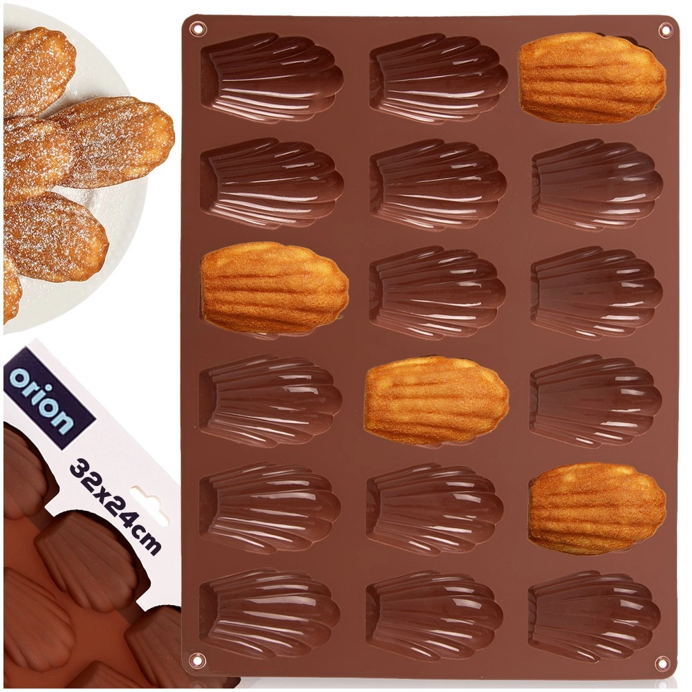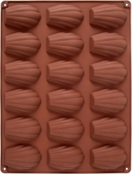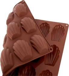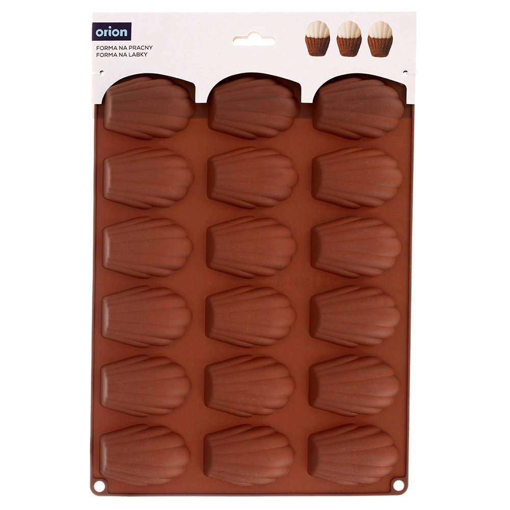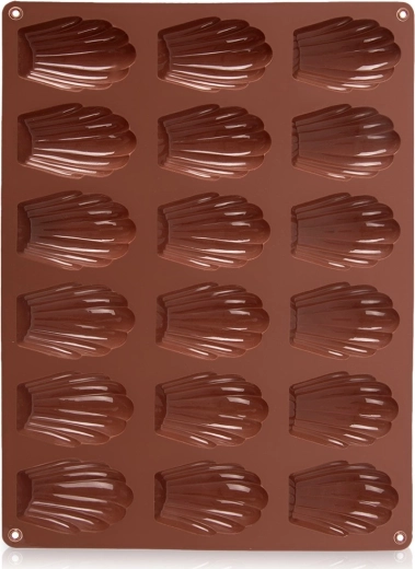 Táto hnedá silikónová forma je ideálna na domáce pečenie madeleiniek, mini tortičiek aj výrobu praliniek a čokoládok v tvare mušle. Rozmery formy 32 × 24,5 × 2 cm pojmú 18 dutiniek, každá o veľkosti približne 7 × 4,5 cm. Nepohlcuje pachy ani chute, skvele vedie teplo a vďaka pružnosti sa dezerty ľahko vyberú bez nutnosti vymazania.