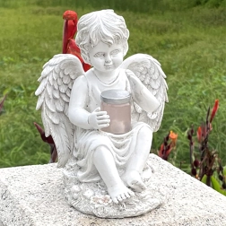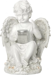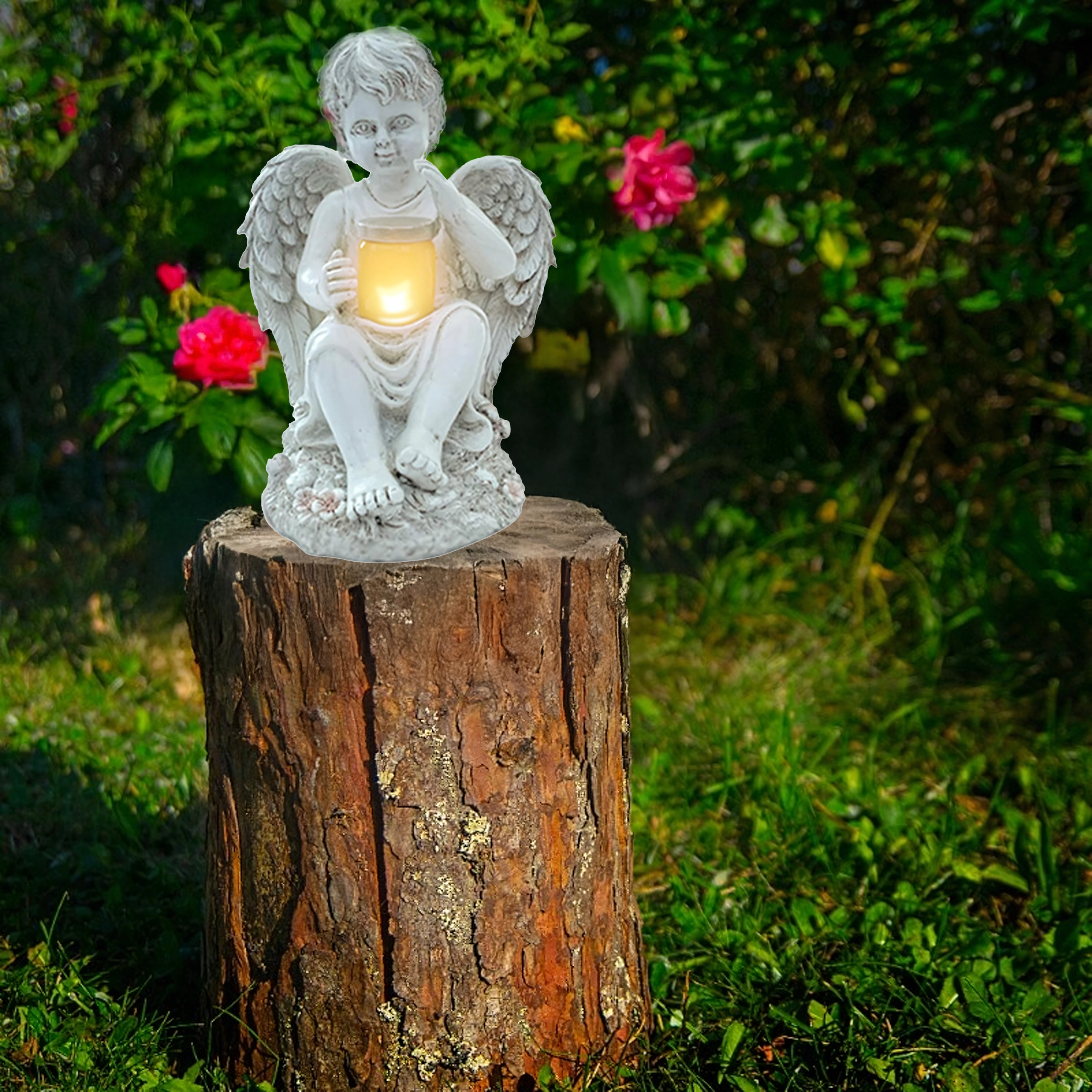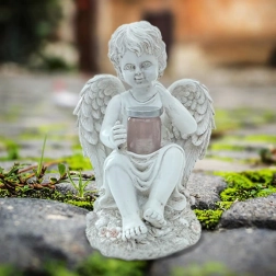Jemné, teplé svetlo v nádobke, ktorú anjel drží, vytvára upokojujúcu večernú atmosféru v záhrade či pri pamätníku.