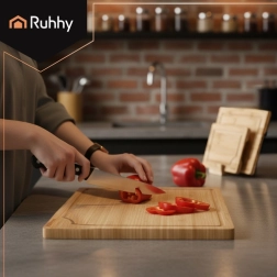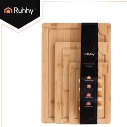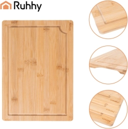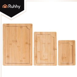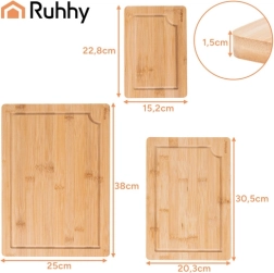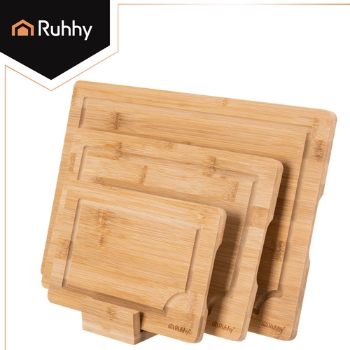 Praktická sada troch bambusových dosiek RUHHY v rôznych veľkostiach s pevným stojanom na prehľadné ukladanie. Prírodný bambus je odolný a hygienický, šetrný k ostriu nožov a rýchlo schne. Integrované drážky na odvod šťavy pomáhajú udržať poriadok pri krájaní mäsa, zeleniny aj ovocia. Ideálne do každej kuchyne na krájanie aj servírovanie.