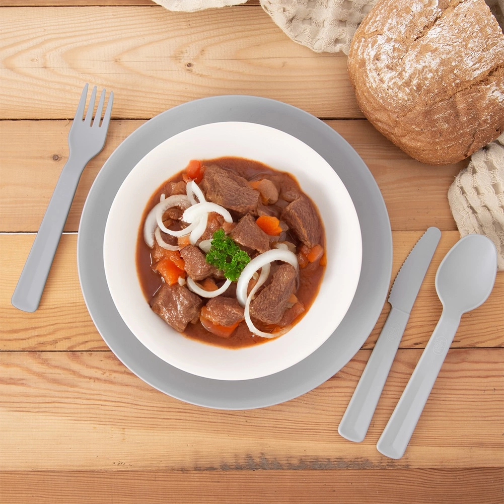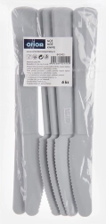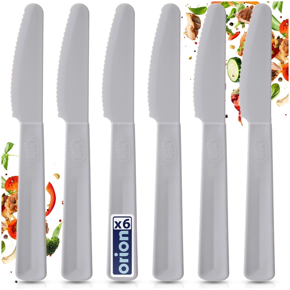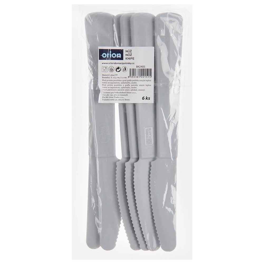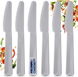 Praktická sada 6 ľahkých a odolných plastových nožov v sivej farbe na každodenné stolovanie doma aj vonku. Bezpečné vrúbkované ostrie si poradí so sendvičmi, ovocím aj ľahkými jedlami, nože sú vhodné do umývačky a predstavujú jednoduchú alternatívu ku kovovým príborom.