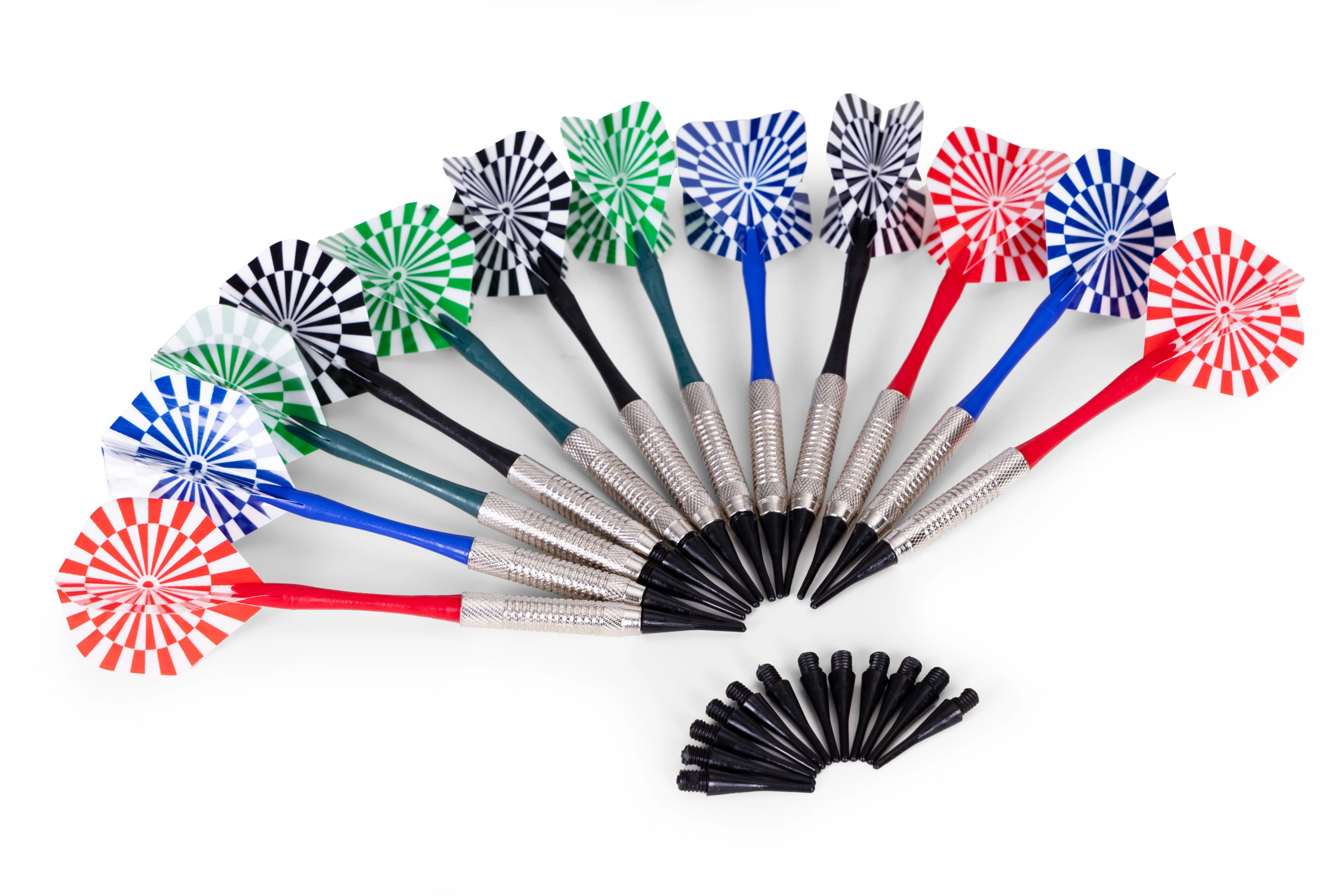 V balení nájdete 12 mäkkých šípok s dekoratívnymi letkami a 12 náhradných hrotov. Kvalitné spracovanie a vyváženie šípok podporujú presnú a opakovateľnú techniku hodu. Súčasťou je tiež montážna sada a návod s pravidlami hier – zapojte, zvoľte režim a hrajte.
