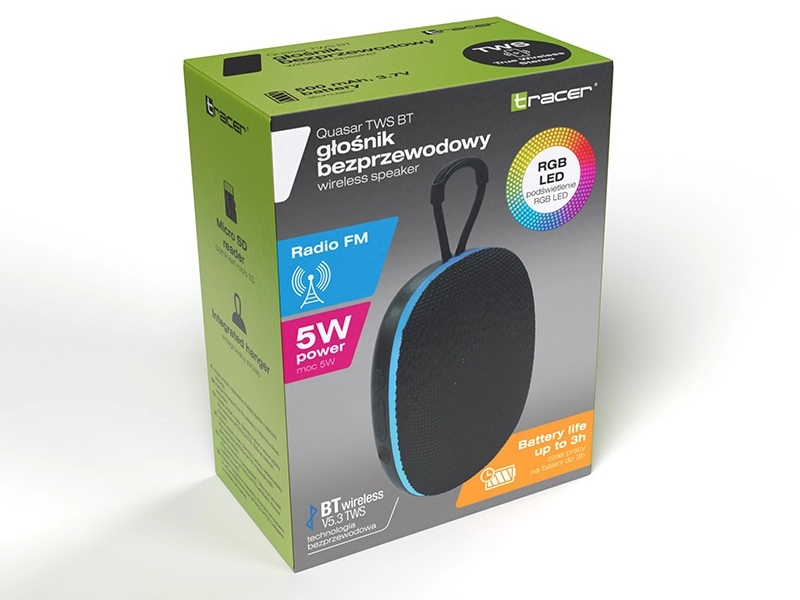 Kompaktný a ľahký reproduktor TRACER Quasar TWS BT si vezmete kamkoľvek. Ponúka Bluetooth 5.3 pre stabilné pripojenie, TWS párovanie dvoch jednotiek pre stereo, výkon 5 W, až 3 hodiny prehrávania z batérie 500 mAh, integrované FM rádio a prehrávanie z microSD/USB – to všetko v odolnom tele s praktickým pútkom.