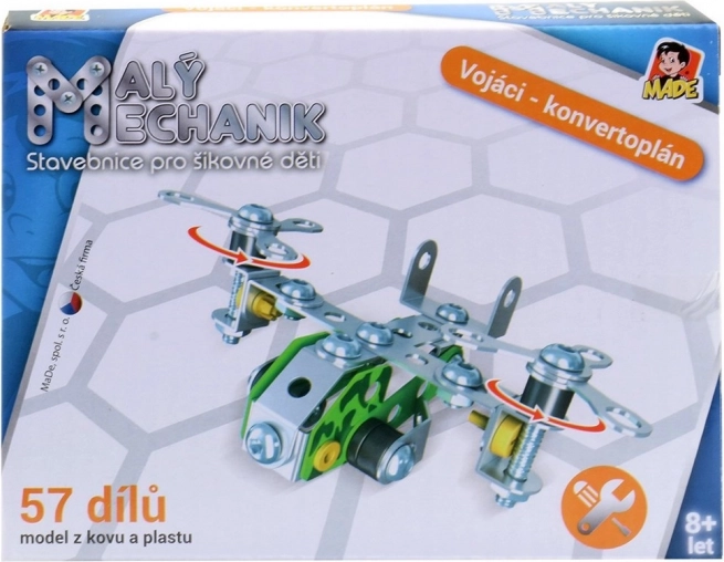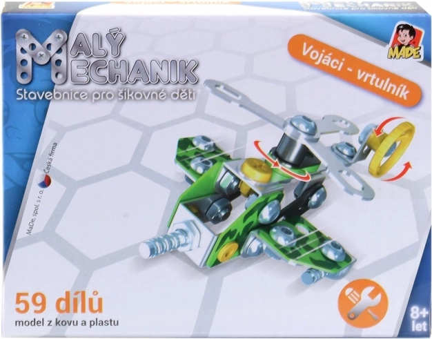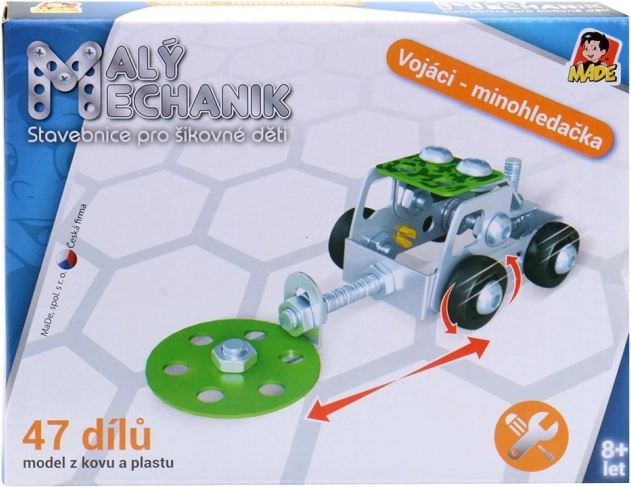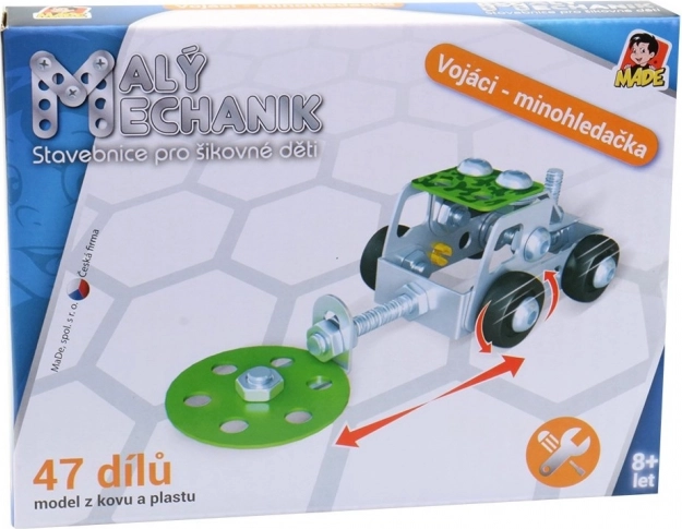 Kovová stavebnica Malý mechanik – vojenská technika pre deti 8+. Odolné prevedenie, rozmer 14,5 × 11 × 2,5 cm, 6 ks v display boxe. Skvelý darček.
