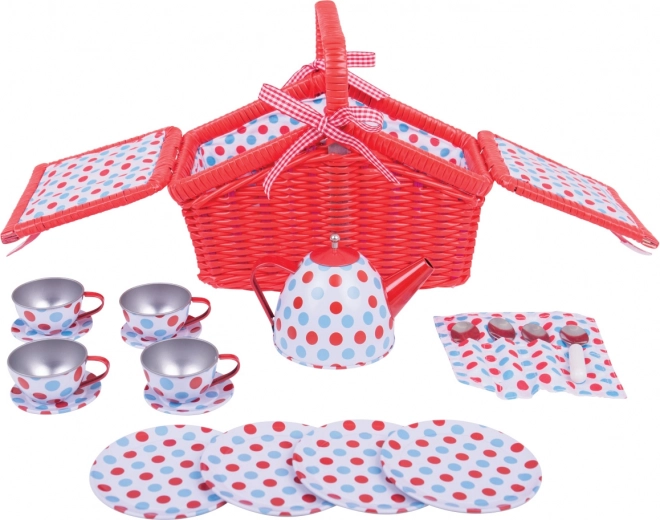 Okúzľujúca čajová súprava v červenom prútenom koši prináša radosť z hrania. Obsahuje štyri šálky, tanieriky, kanvicu s lyžičkami, ideálna pre detské čajové párty doma aj na cestách.