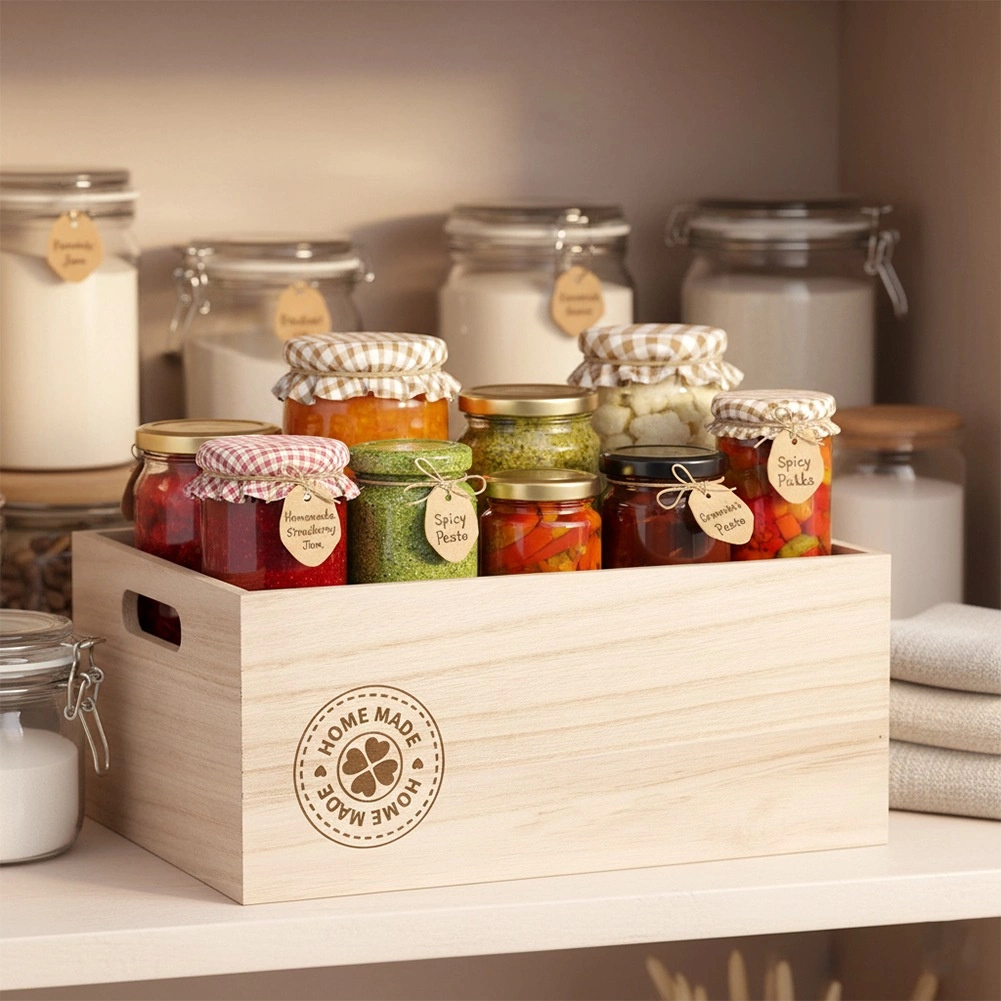 Objavte elegantné a funkčné riešenie na každodennú organizáciu. Drevená úložná debnička s rozmermi 26 × 16,5 × 11,5 cm vyniká prírodným vzhľadom, pevnou konštrukciou a pohodlnými úchytmi na bezpečné prenášanie. Dekoratívna potlač „Home Made“ dodá vášmu interiéru útulný nádych.