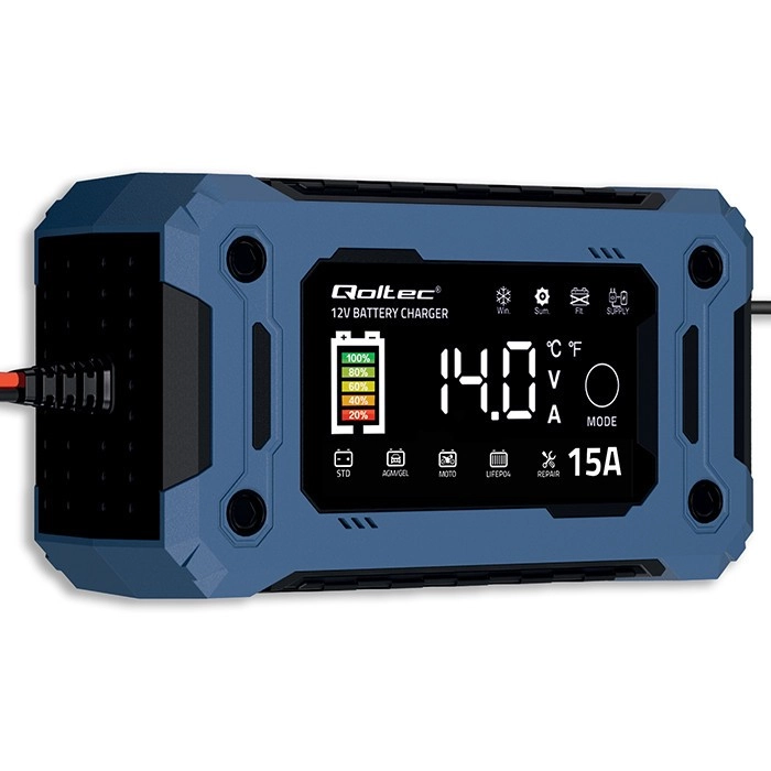 Predĺžte životnosť svojej batérie s inteligentnou nabíjačkou riadenou mikroprocesorom. Automaticky rozpozná typ akumulátora, prispôsobí nabíjaciu krivku a po plnom dobití prejde do udržiavacieho režimu, takže nehrozí prebitie. Veľký LCD displej zobrazuje napätie, prúd, stav nabíjania aj zvolený režim a dotykové tlačidlo MODE zjednodušuje ovládanie.