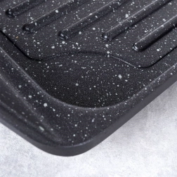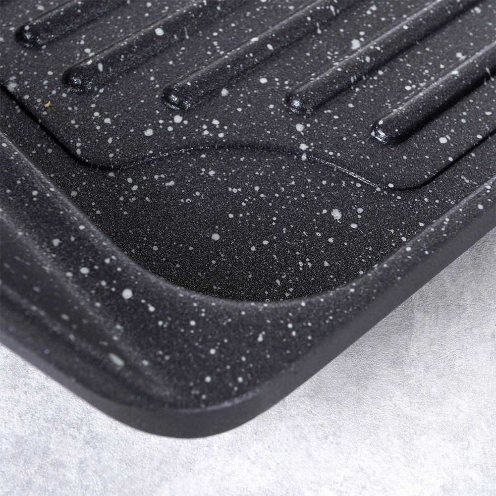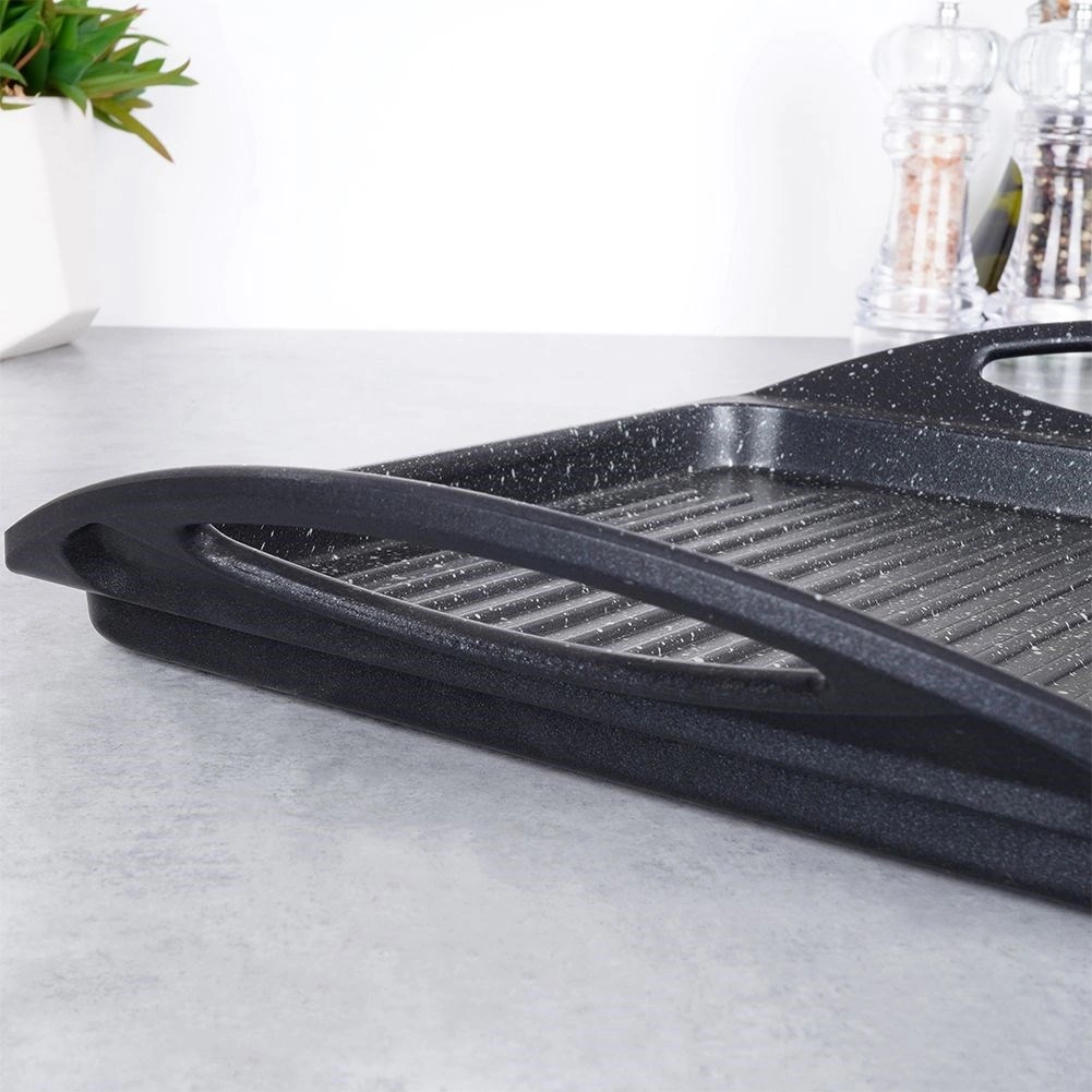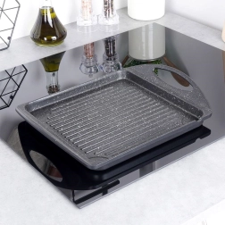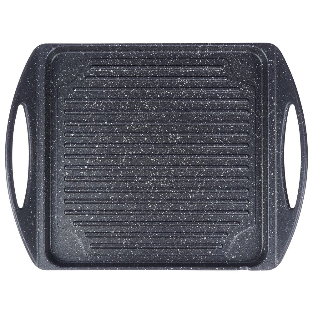 Všestranná grilovacia doska GRANDE vám umožní pohodlne grilovať a smažiť priamo na sporáku, v rúre aj na grile. Nepriľnavý granitový povrch PFLUON GRANIT je odolný proti poškrabaniu a vysokým teplotám, takže suroviny sa nepripaľujú a zachovajú si svoj autentický chuťový profil aj výživové hodnoty. Ryhovaný povrch odvádza prebytočný tuk a vytvára atraktívne mriežkovanie.