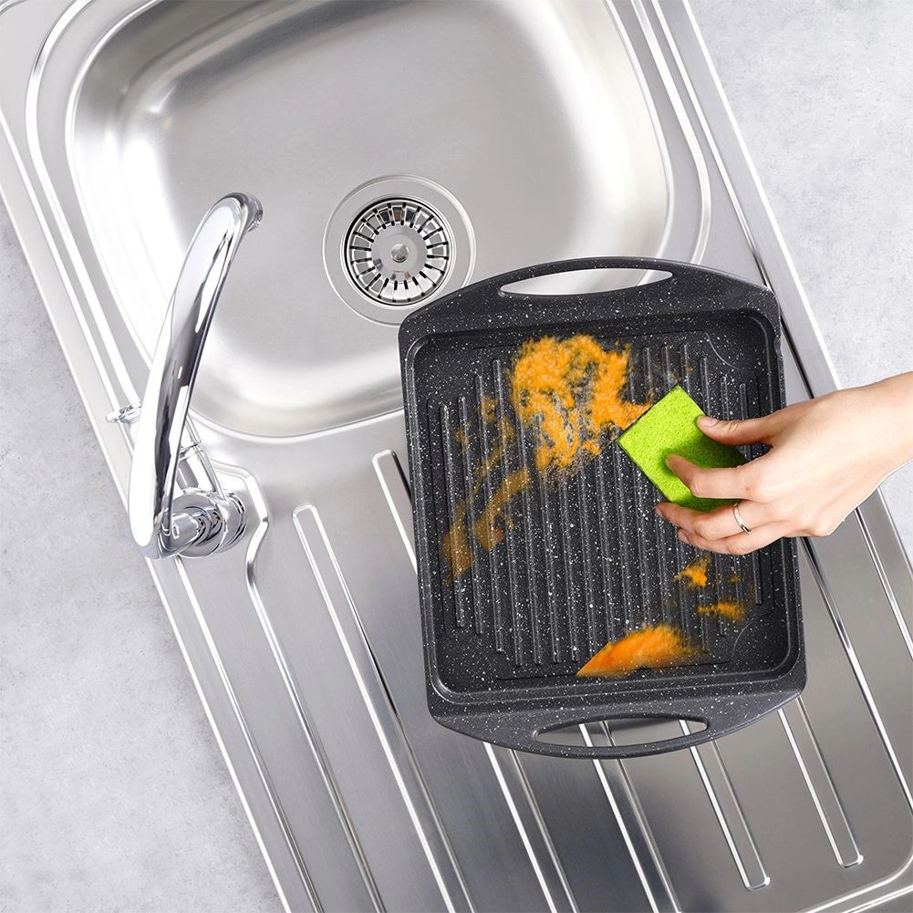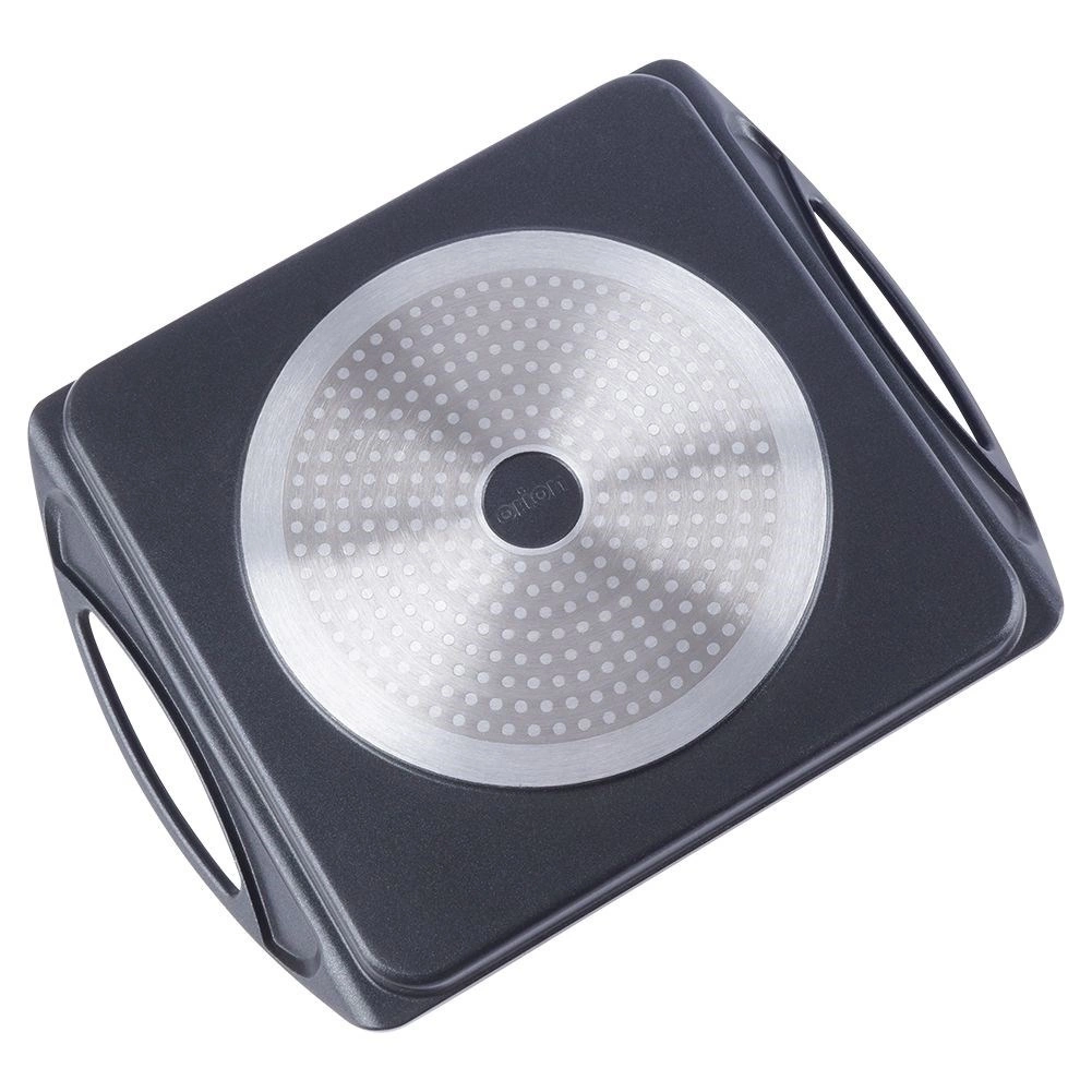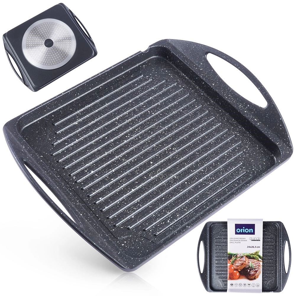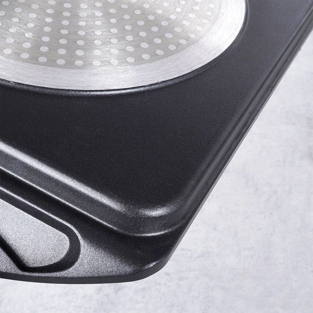 Vďaka hliníkovému jadru sa doska rýchlo a rovnomerne rozohieva, čím šetrí energiu. Integrované bočné madlá zaisťujú bezpečnú manipuláciu. Po použití ju ľahko umyjete – je vhodná aj do umývačky. Dosku možno použiť na plynových, elektrických, sklokeramických a indukčných varných doskách, v rúre aj na grile (neumiestňujte priamo do plameňov).