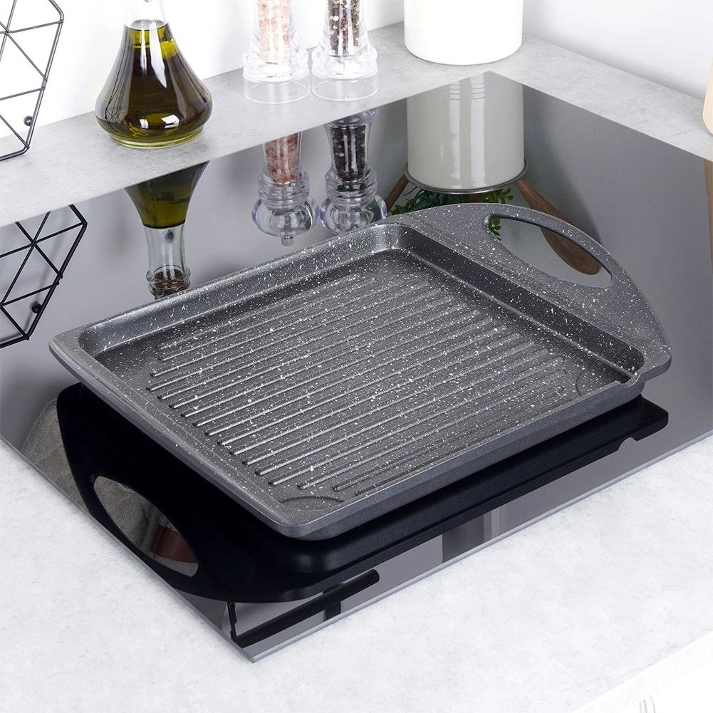 Praktická grilovacia doska s rozmermi 34 × 26,5 cm na zdravé varenie doma aj na záhrade. Vďaka nepriľnavému granitovému povrchu PFLUON GRANIT, ryhovanému povrchu pre výrazné grilovacie prúžky a univerzálnej kompatibilite s plynovými, elektrickými, sklokeramickými aj indukčnými sporákmi pripravíte chrumkavé mäso, zeleninu aj ryby s minimom tuku. Rýchle a rovnomerné zohrievanie, robustné hliníkové telo a ľahké čistenie v umývačke z nej robia spoľahlivého pomocníka.