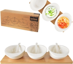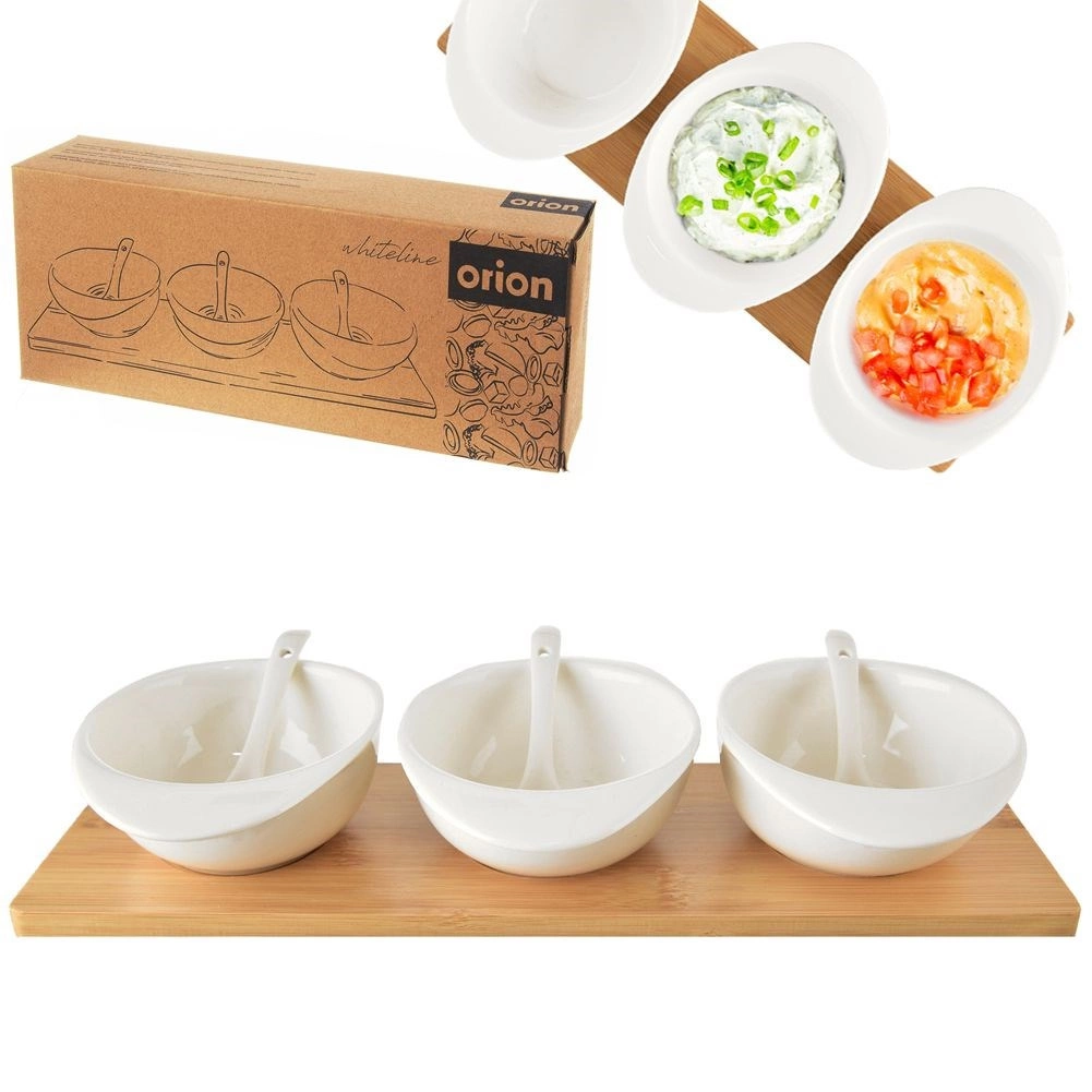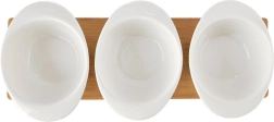 Elegantná sada troch bielych porcelánových misiek s lyžičkami na pevnom bambusovom tácke pre štýlové servírovanie. Ideálne na dipy, omáčky, predjedlá a pochutiny. Kvalitný porcelán a odolný bambus zaistia dlhú životnosť, vyberateľné misky sa ľahko prenášajú aj umývajú. Vhodné do umývačky a mikrovlnky.