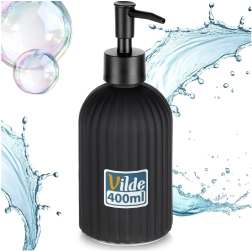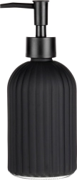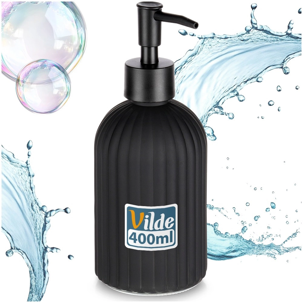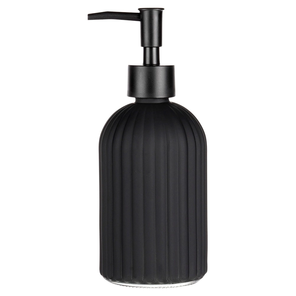 Elegantný sklenený dávkovač na tekuté mydlo alebo prostriedok na riad s objemom 400 ml v matnej čiernej farbe. Vďaka ryhovanému povrchu skvele padne do ruky, moderný dizajn sa hodí do kúpeľne aj kuchyne a jednoduché dopĺňanie šetrí čas aj peniaze.