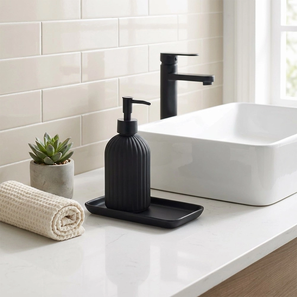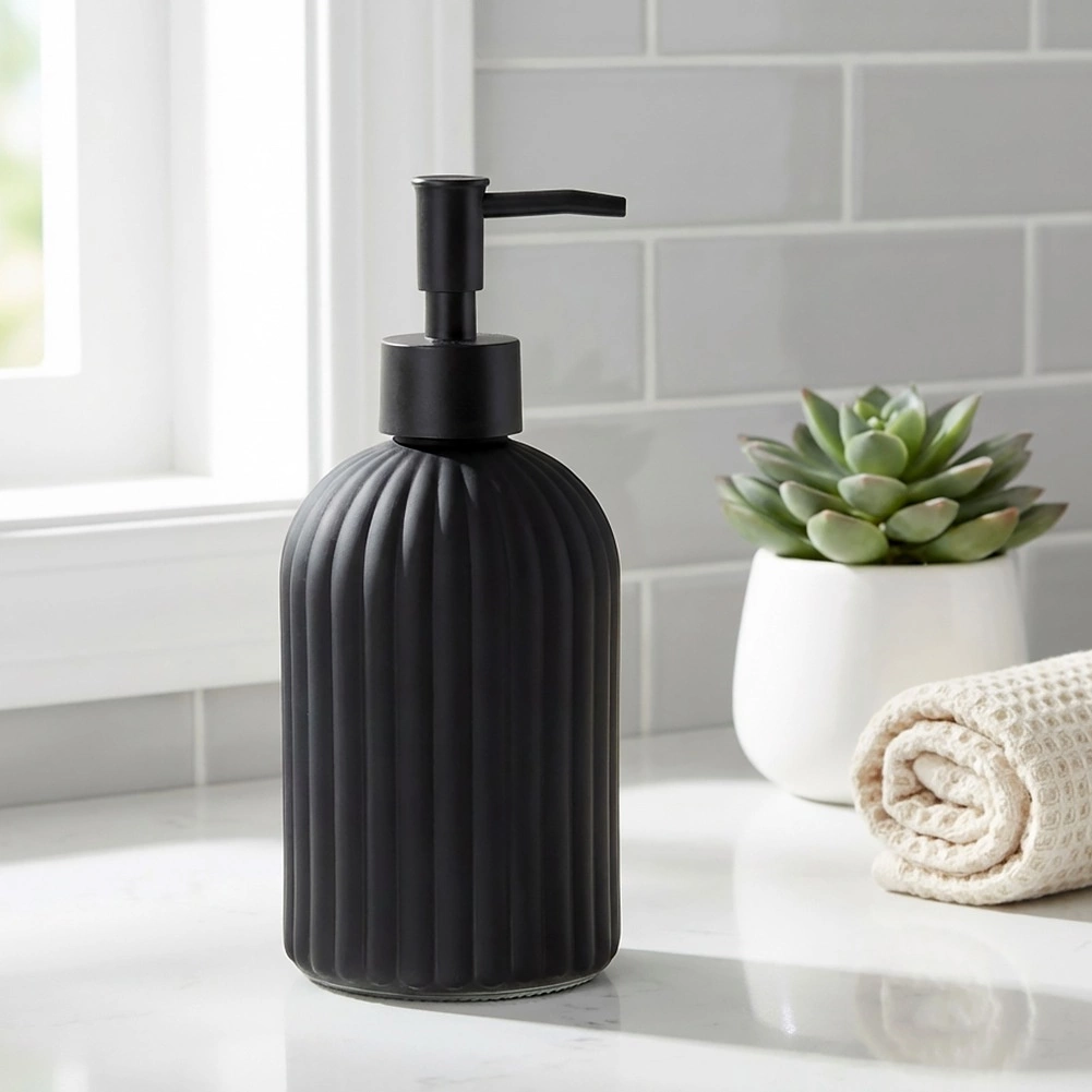 Štýlový dávkovač mydla z kvalitného skla v matnej čiernej farbe je praktickým aj dekoratívnym doplnkom pre vašu kúpeľňu či kuchyňu. Textúrovaný, ryhovaný povrch zabezpečuje istý úchop a odolnosť, zatiaľ čo čisté línie podčiarkujú moderný vzhľad interiéru.