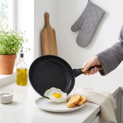 Objavte odolnú panvicu z línie TERRUNA, ktorá kombinuje moderný dizajn a prvotriednu funkčnosť. Nepriľnavá granitová vrstva umožňuje variť s minimom oleja, ľahko sa čistí a je ideálna na smaženie aj dusenie mäsa, zeleniny či vajec.