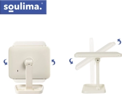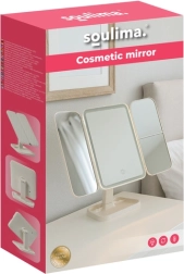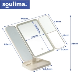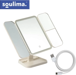 Elegantné kozmetické zrkadlo SOULIMA premení váš toaletný stolík na malé beauty štúdio. Trojdielna skladacia konštrukcia s centrálnym zrkadlom a dvoma bočnými krídlami ponúka viac uhlov pohľadu, zväčšenie 2× a 3× uľahčí precízne líčenie. LED osvetlenie s nastaviteľnou teplotou 3000–7000 K zaistí prirodzené farby za akýchkoľvek podmienok. Praktický dotykový ovládač, otáčanie až 270° a vstavaná batéria 600 mAh s nabíjaním USB‑C robia zo zrkadla štýlového a funkčného pomocníka.