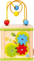 Táto multifunkčná motorická kocka spája päť obľúbených aktivít: vkladanie tvarov, súkolie so ozubenými kolieskami, kľukaté vodiče s posuvnými dielikmi, priraďovanie zvieratiek k ich potrave a horné korálkové bludisko. Každá strana kocky je navrhnutá tak, aby podnecovala koordináciu ruka–oko, trpezlivosť a sústredenie.