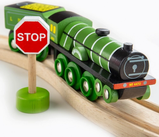 Táto drevená lokomotíva Flying Scotsman od značky Bigjigs Rail prináša kúsok histórie do vášho domova. Sada obsahuje 1 kus lokomotívy, 1 kus vagónika a 3 kusy koľají. Lokomotíva je vyrobená z kvalitných a zodpovedne získaných prírodných materiálov, čo zaručuje jej dôveruhodnosť a espresso sa spôsobom pre ryze európske normy.