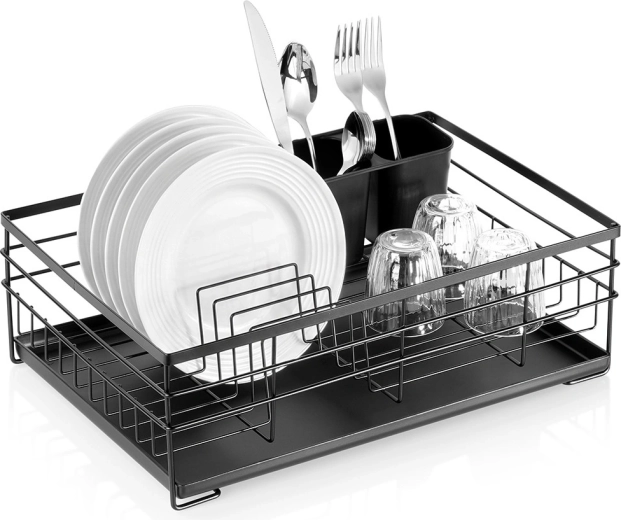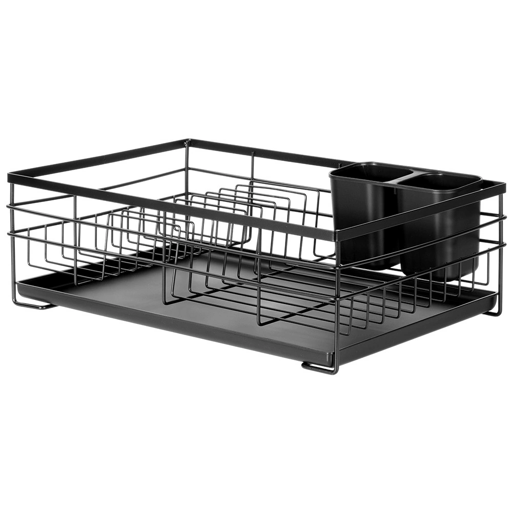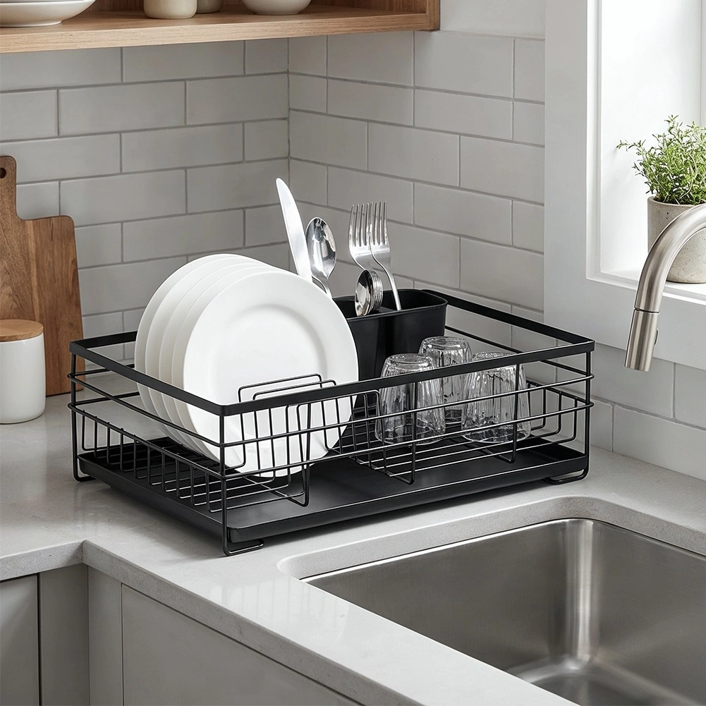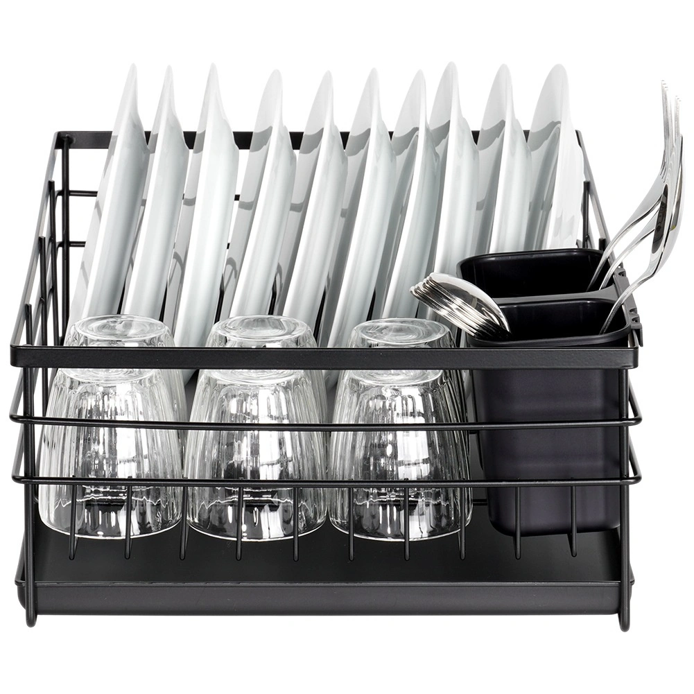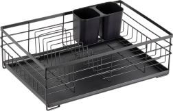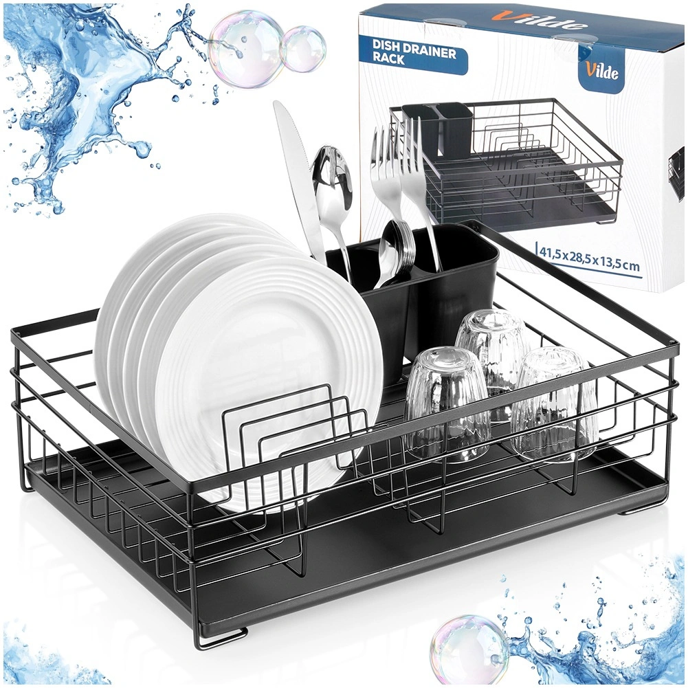 Praktický a štýlový odkvapkávač na riad v čiernej farbe pre prehľadné sušenie tanierov, pohárov a príborov. Ponúka veľkú kapacitu, odolnú kovovú konštrukciu a vyberateľnú odkvapkávaciu tácku, ktorá chráni kuchynskú linku pred vodou.