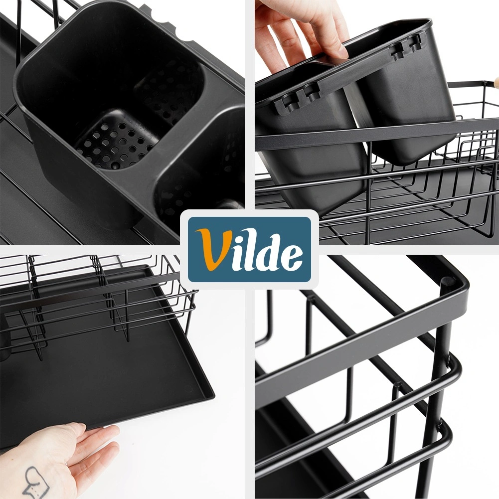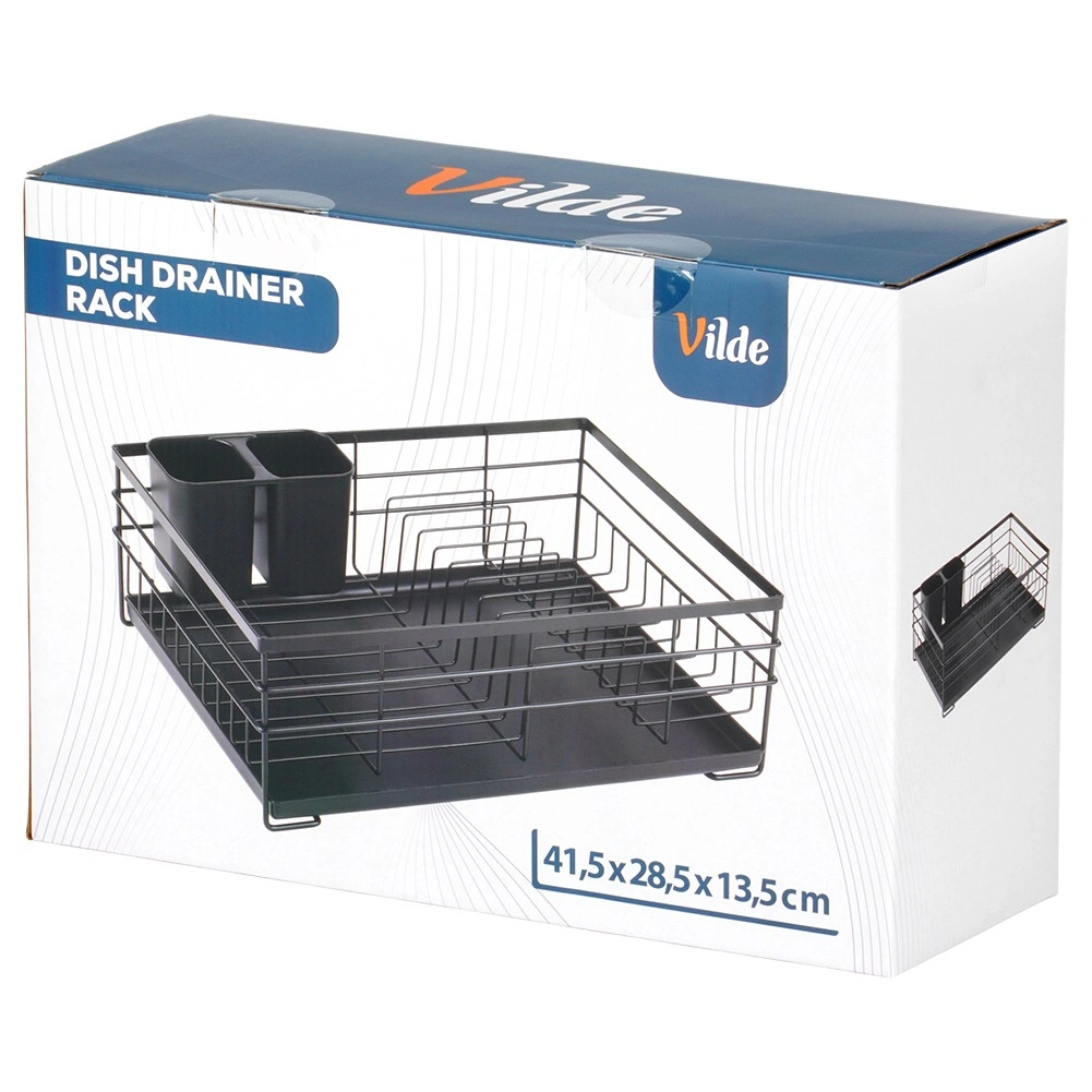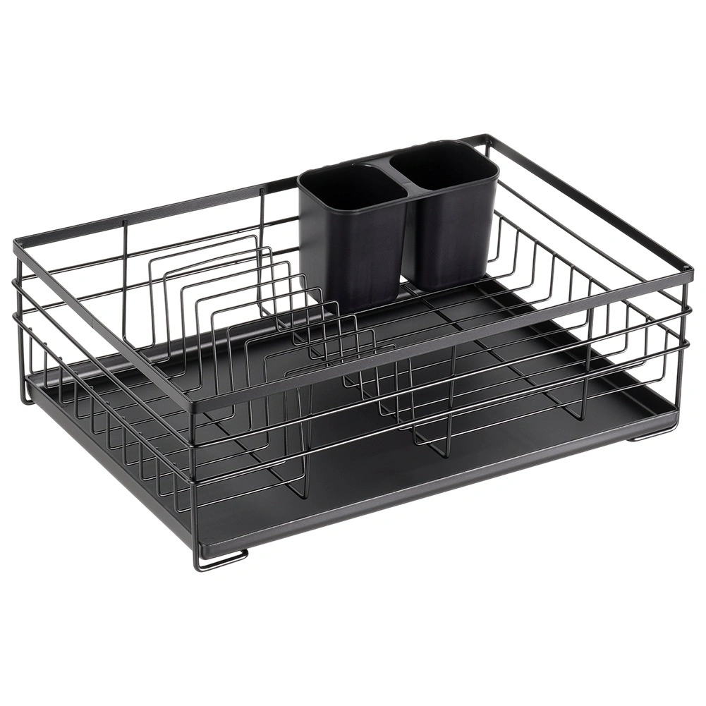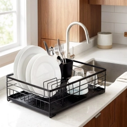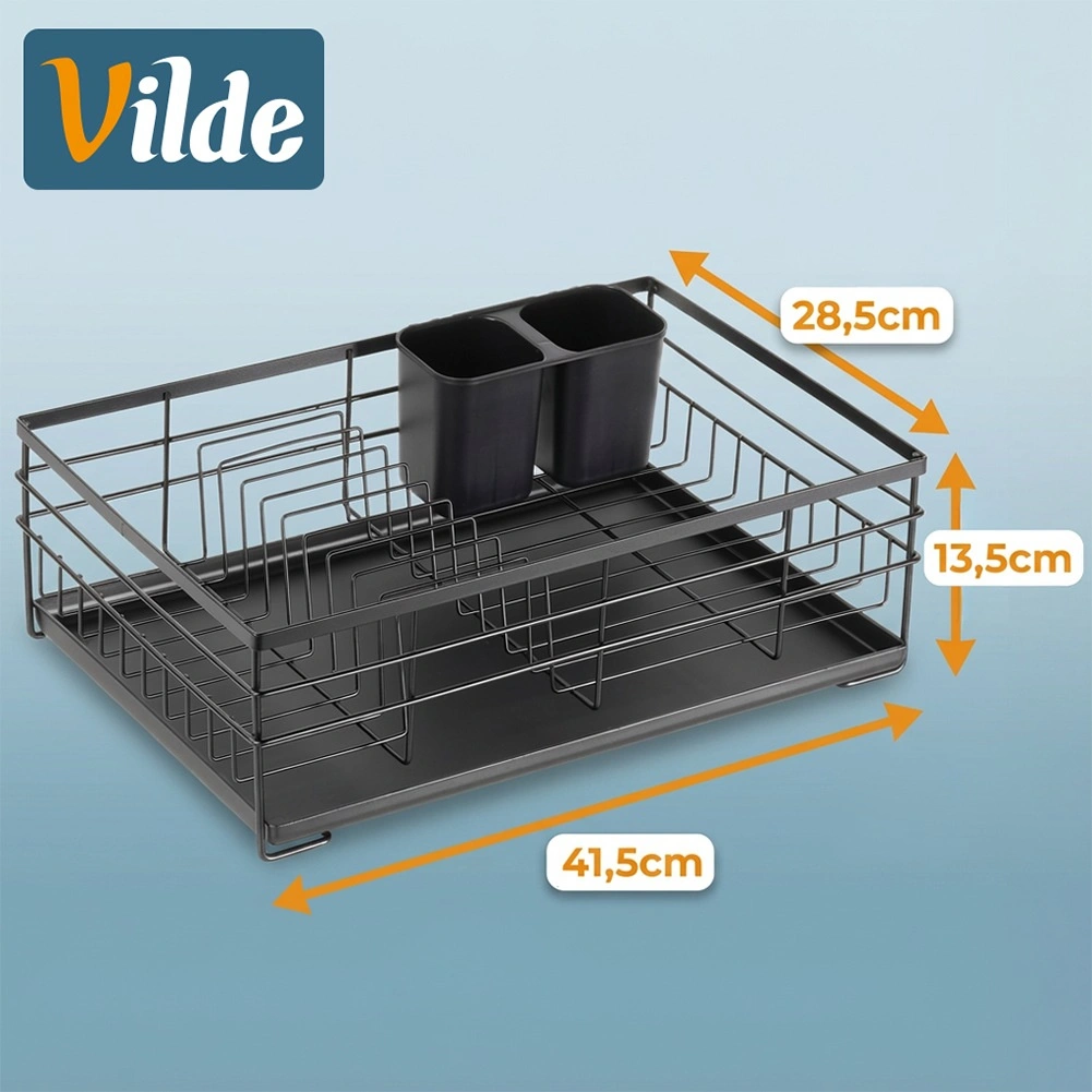 Praktický a štýlový odkvapkávač na riad v čiernej farbe pre prehľadné sušenie tanierov, pohárov a príborov. Ponúka veľkú kapacitu, odolnú kovovú konštrukciu a vyberateľnú odkvapkávaciu tácku, ktorá chráni kuchynskú linku pred vodou.