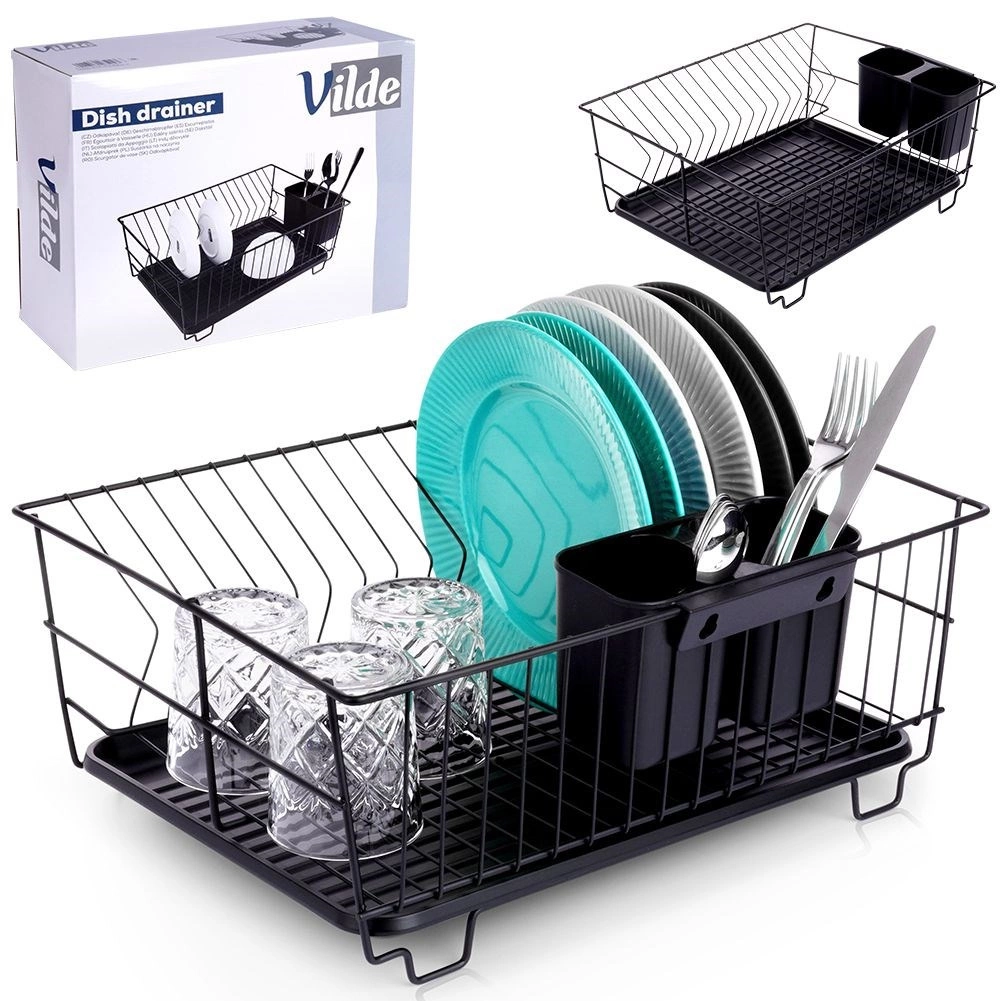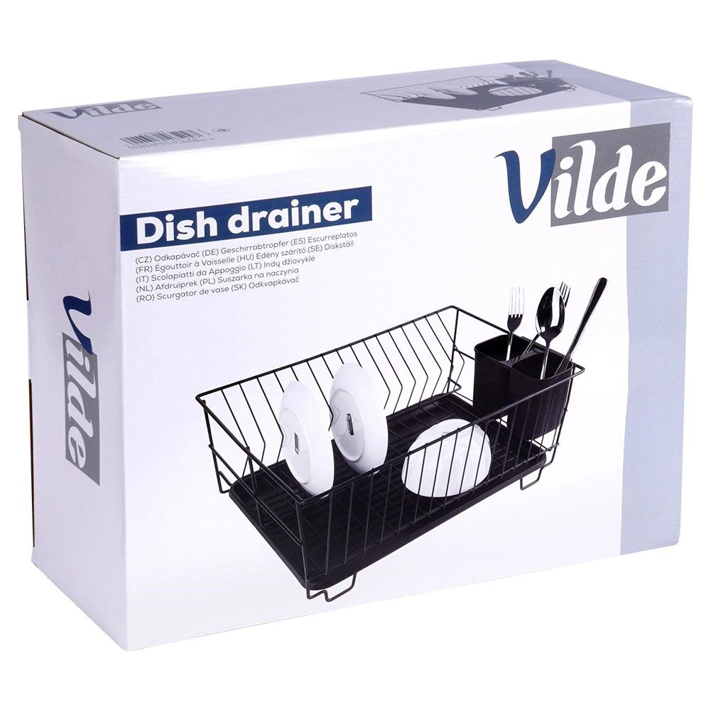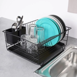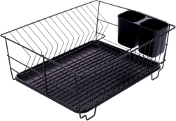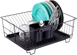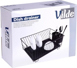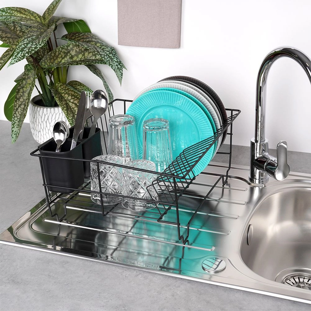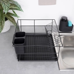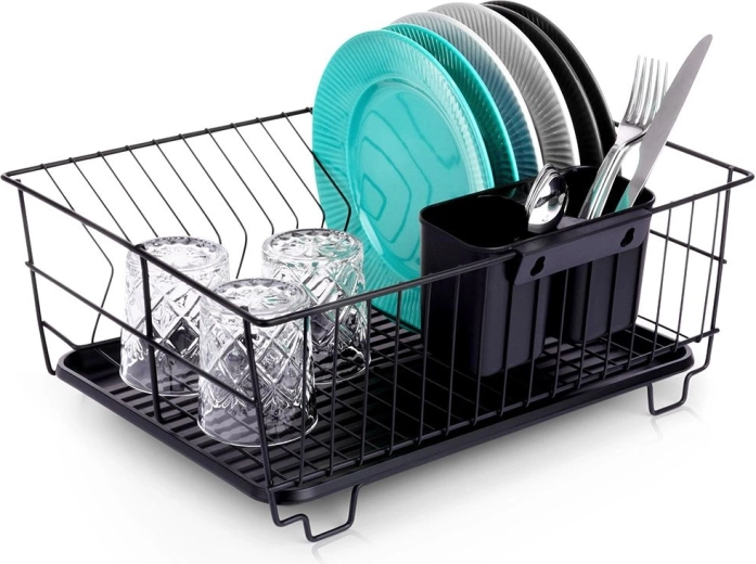 Kompaktný čierny odkvapkávač na riad s rozmermi 40 × 33 × 17 cm ponúka priestorné miesto pre taniere, poháre a príbor. Vďaka vyberateľnej odkvapkávacej tácke a dvojkomorovému košíku na príbor udrží vašu kuchyňu čistú a organizovanú. Pevná kovová konštrukcia v industriálnom štýle sa ľahko čistí a spoľahlivo chráni pracovnú dosku pred vodou.