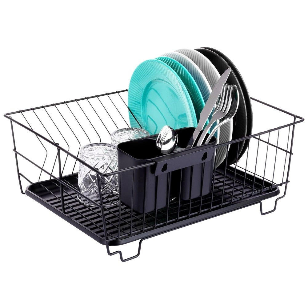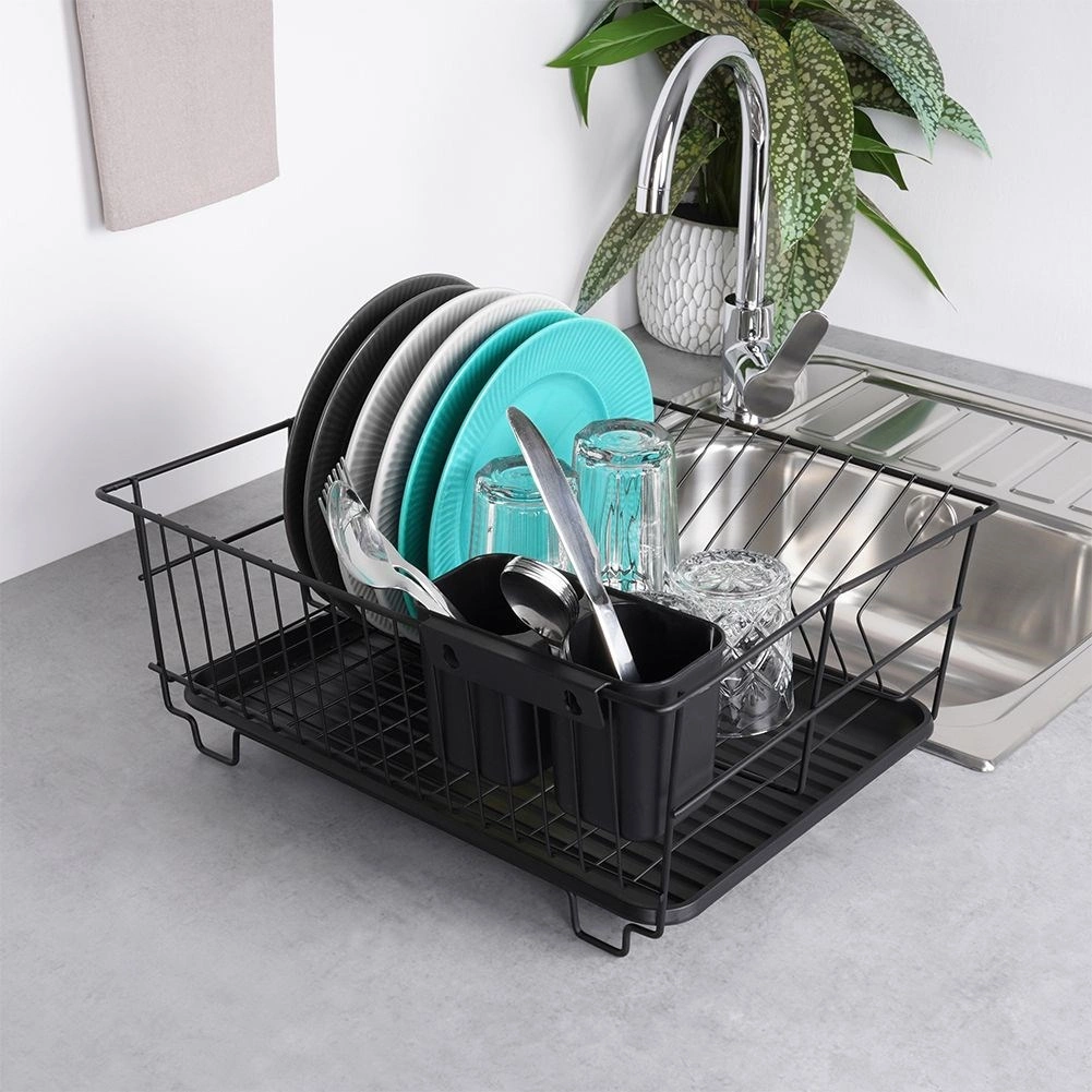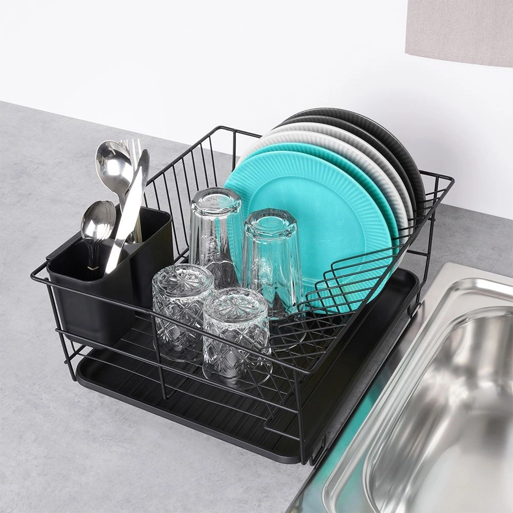 Kompaktný čierny odkvapkávač na riad s rozmermi 40 × 33 × 17 cm ponúka priestorné miesto pre taniere, poháre a príbor. Vďaka vyberateľnej odkvapkávacej tácke a dvojkomorovému košíku na príbor udrží vašu kuchyňu čistú a organizovanú. Pevná kovová konštrukcia v industriálnom štýle sa ľahko čistí a spoľahlivo chráni pracovnú dosku pred vodou.