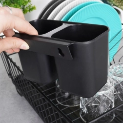 Dvojkomorový, odnímateľný košík na príbor možno zavesiť dovnútra alebo zvonka sušiaka podľa potreby, čo zvyšuje kapacitu pre poháre či hrnčeky. Vďaka premyslenej konštrukcii je odkvapkávač ľahko umývateľný a môže slúžiť aj ako komorová sušička v dreze.
