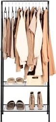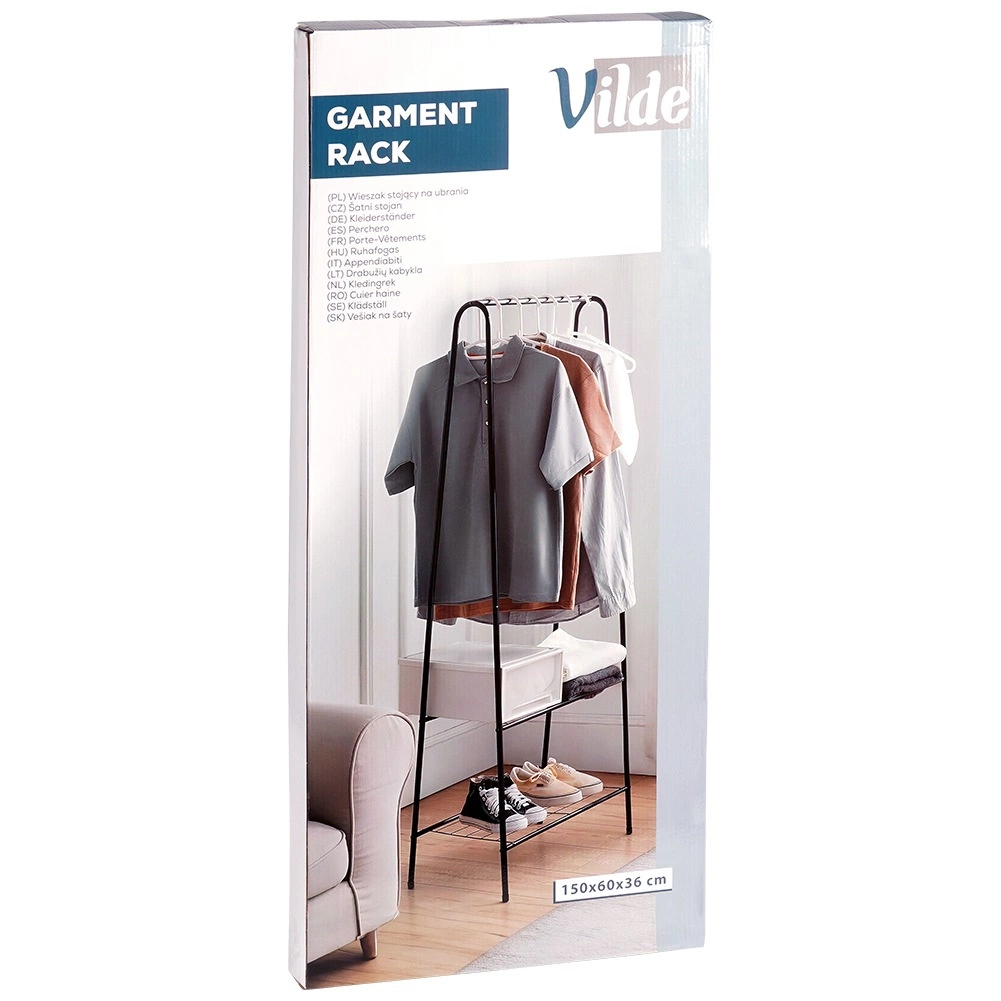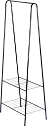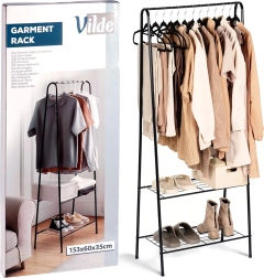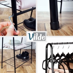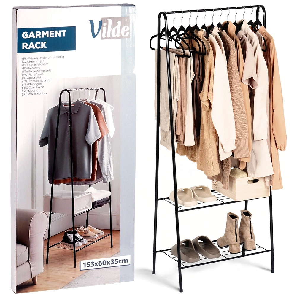 Tento voľne stojaci kovový vešiak s rozmermi 60 × 35 × 153 cm poskytuje spoľahlivé a elegantné miesto na zavesenie košieľ, kabátov či šiat, zatiaľ čo dvojica spodných políc udrží vaše topánky, krabice alebo doplnky prehľadne a po ruke. Minimalistický otvorený dizajn ľahko zapadne do moderných interiérov.