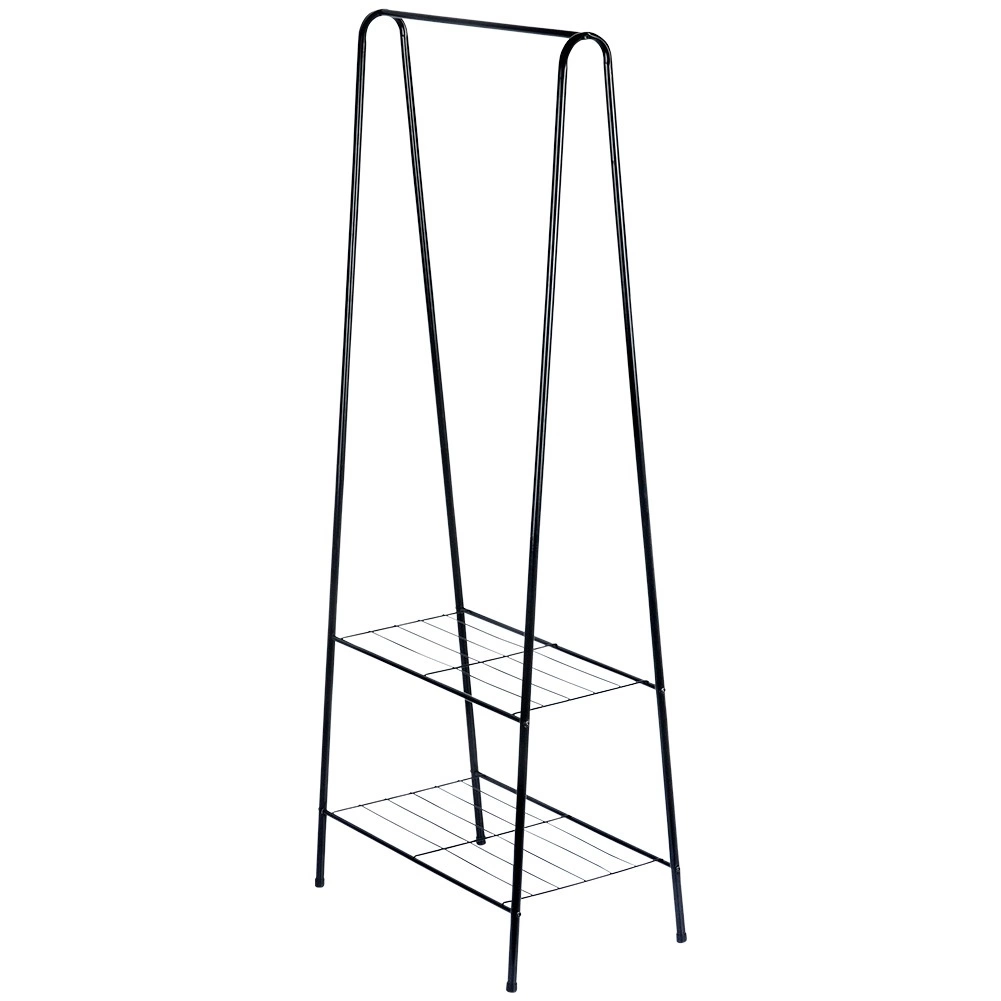 Praktický a štýlový stojanový vešiak v industriálnom štýle LOFT ponúka úsporné riešenie na prehľadné uloženie oblečenia a obuvi. Vďaka pevnej kovovej konštrukcii v čiernej farbe, dvom drôteným policiam a hornej tyči na vešiaky je ideálny do predsiene, spálne, šatne aj kancelárie.