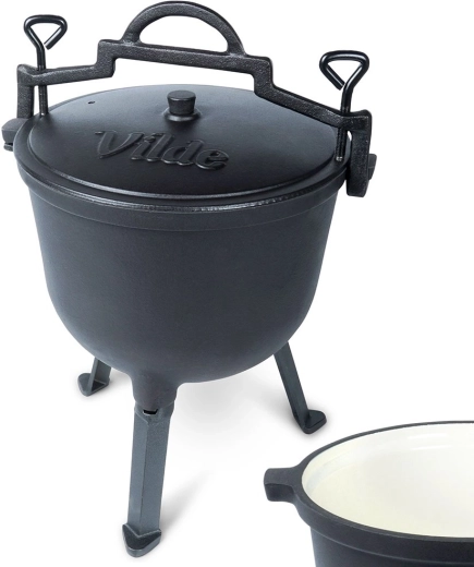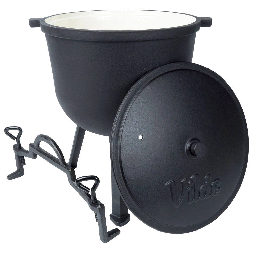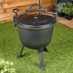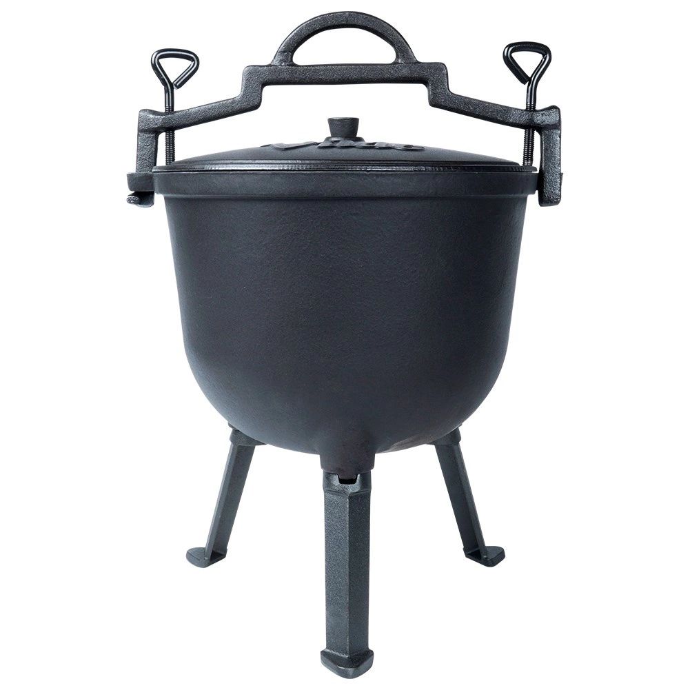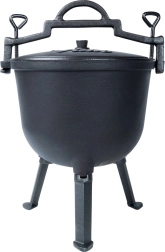 Kotlík stojí na troch stabilných nožičkách pre bezpečné použitie na ohni či nad ohniskom. Veko má ventilačný otvor a dve aretačné skrutky na bezpečné dovretie počas varenia alebo prenášania. Veľké horné madlo a bočné úchyty uľahčia manipuláciu. Ideálny na záhradu, kemp alebo akékoľvek vonkajšie varenie – jedlá získajú jedinečnú chuť a arómu.