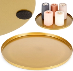 Elegantný okrúhly podnos s priemerom 30 cm je ideálny ako štýlový základ pre sviečky, dekorácie či šperky. Vďaka kovovej konštrukcii s matným zlatým povrchom je odolný, stabilný a ľahko sa čistí. Nekĺzavé a ochranné podložky na spodnej strane chránia nábytok a nízky lem pomáha udržať všetko bezpečne na mieste.