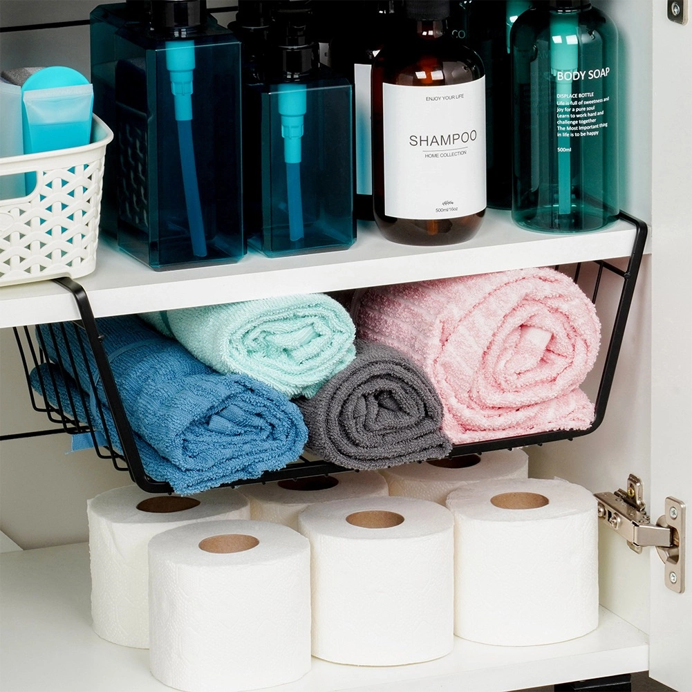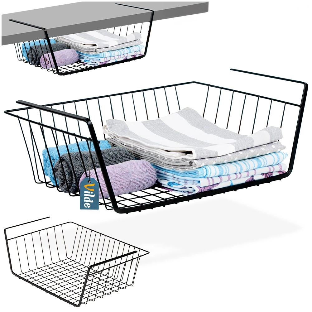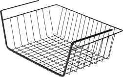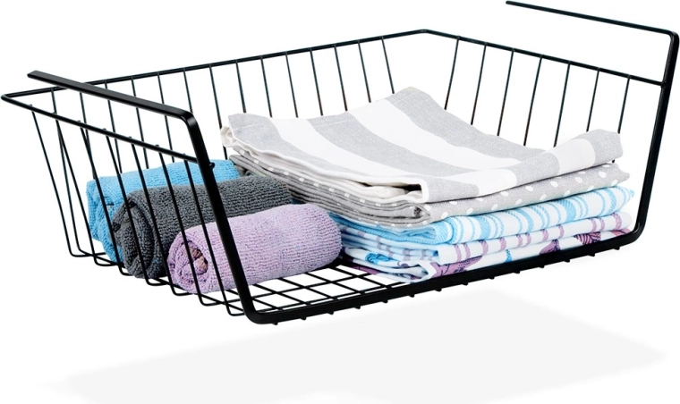 Praktický závesný košík pod policu z kvalitného kovu v čiernej farbe rozšíri úložný priestor behom chvíľky – bez vŕtania a náradia. Vďaka otvorenej drôtenej konštrukcii máte obsah vždy na očiach a je zabezpečené vetranie. Ideálny do kuchyne, kúpeľne, šatníka aj kancelárie na prehľadné uloženie uterákov, textílií či kuchynských potrieb.