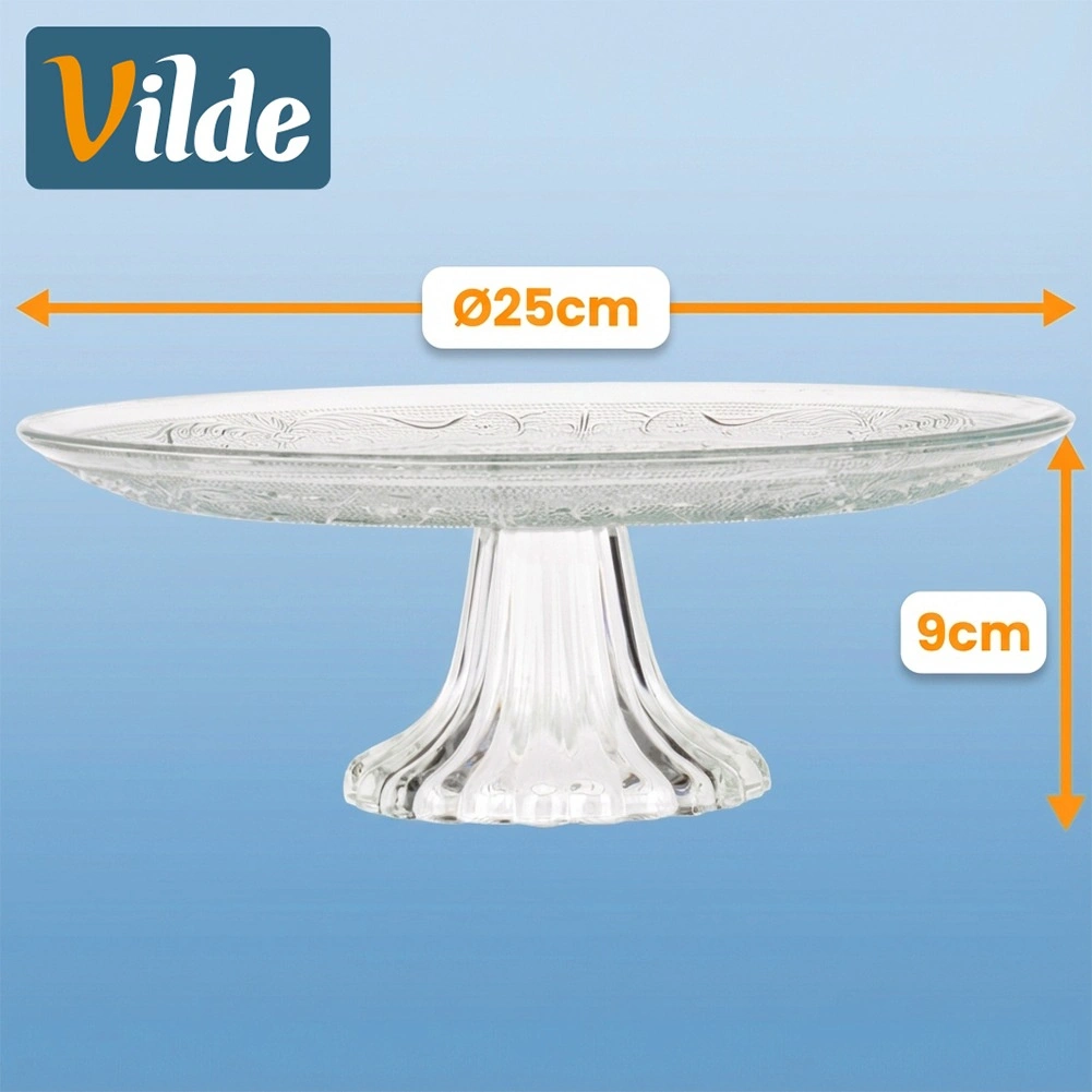 Elegantný sklenený podnos na nohe s priemerom 25 cm na štýlové servírovanie tort, koláčov a dezertov. Priehľadné sklo so zdobením pôsobí ako krištáľ a dodá vášmu stolu luxusný vzhľad. Vďaka zvýšenej konštrukcii vynikne každý dezert, podnos je vhodný do umývačky a skvele sa hodí na domáce aj profesionálne použitie.