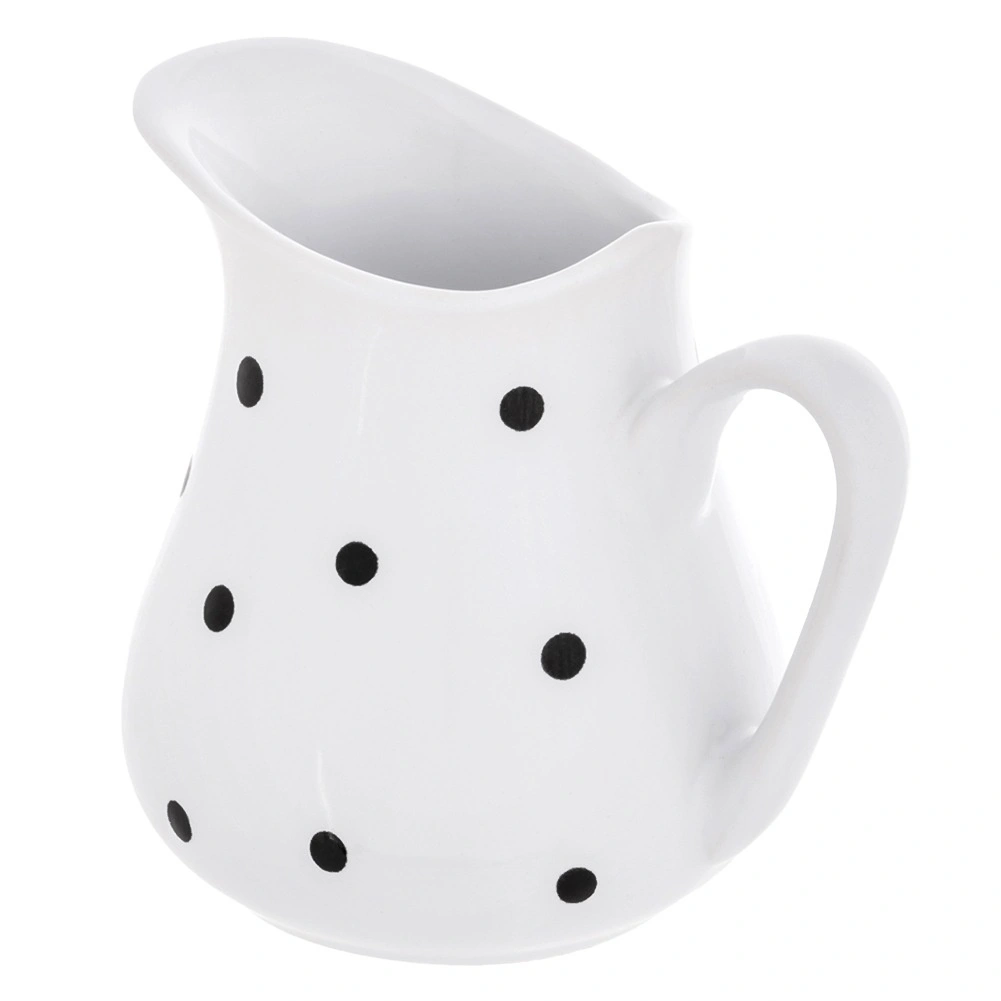 Štýlový keramický džbánik s objemom 480 ml v bielej farbe s čiernymi bodkami je ideálny na každodenné servírovanie. Ponúka univerzálne využitie na vodu, limonádu, víno, mlieko, smotanu či omáčky, má ergonomické ucho a široký výlev na presné nalievanie bez špliechania. Je vhodný do umývačky aj mikrovlnky a vďaka dekoratívnemu dizajnu skvelo vynikne na každom stole.