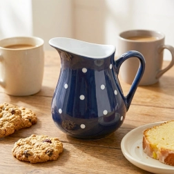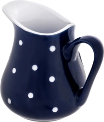 Štýlová keramická kanvička s objemom 480 ml v tmavomodrej farbe s bielymi bodkami je ideálna na servírovanie mlieka, smotany, nápojov aj omáčok. Má ergonomické ucho a tvarovaný zobáčik na presné nalievanie bez rozstreku, je vhodná do umývačky aj mikrovlnky a skvelo doplní každý stôl.