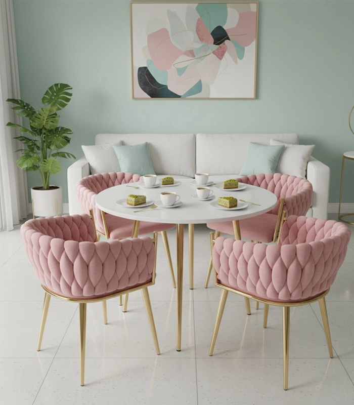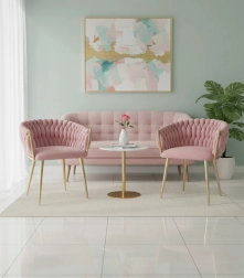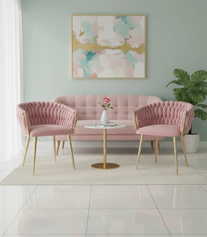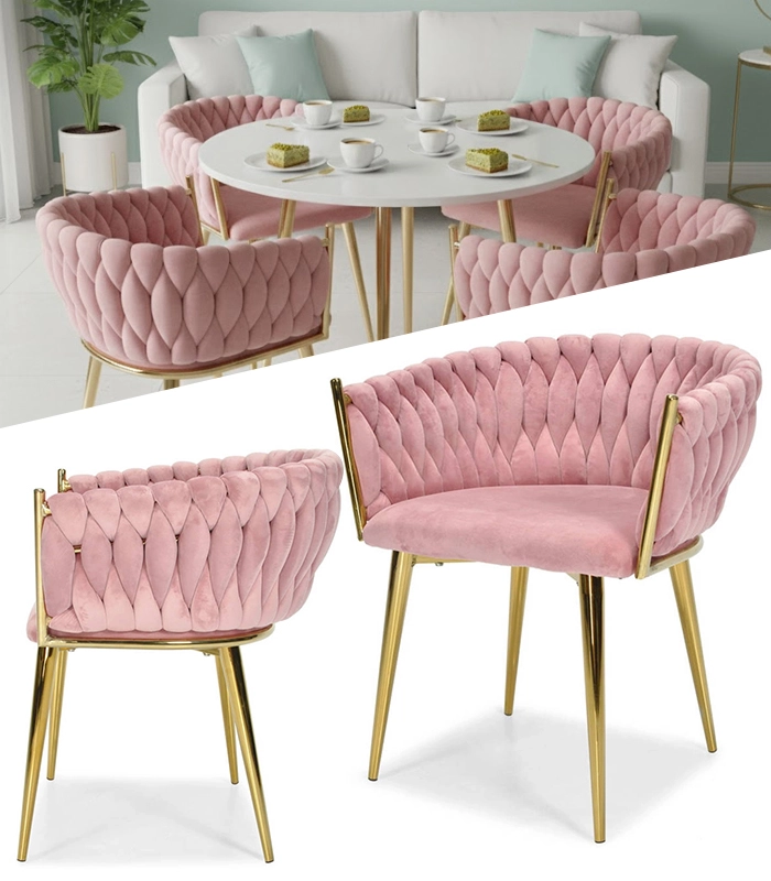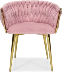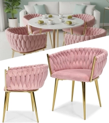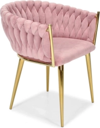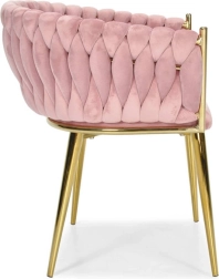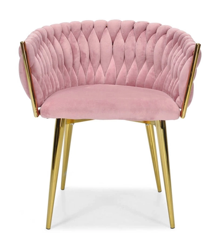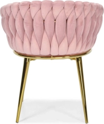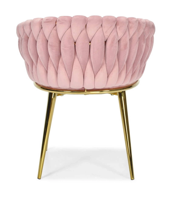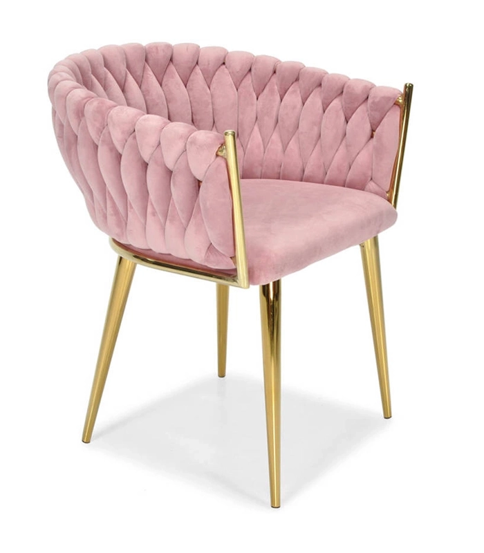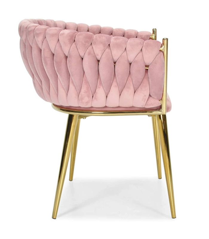 Táto dizajnová stolička je skutočným šperkom interiéru. Pletené velúrové čalúnenie vytvára efektnú 3D štruktúru, ktorá okamžite upúta pozornosť a pôsobí mimoriadne sofistikovane. Púdrovo ružová farba je decentná, a pritom výrazná – ideálna do moderných aj glamour aranžmánov.