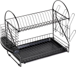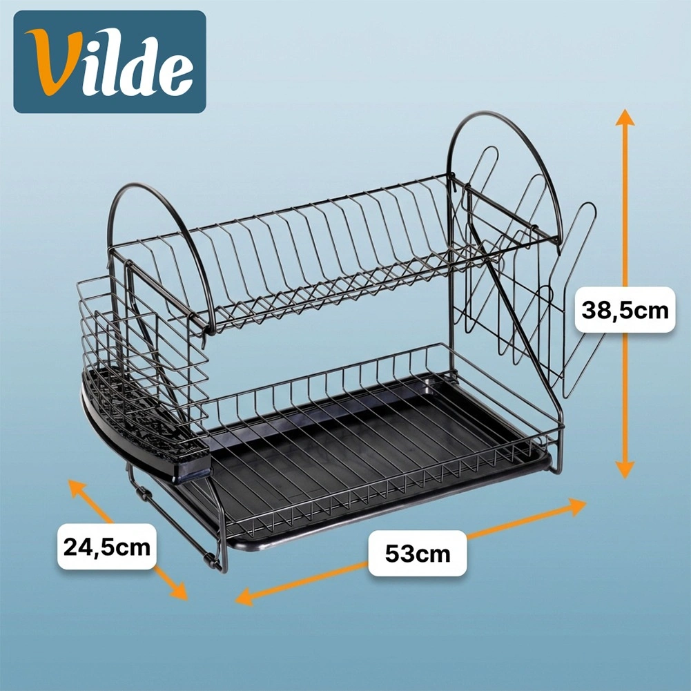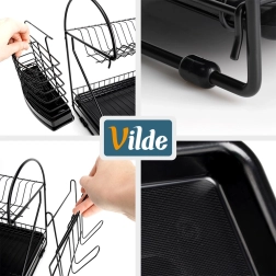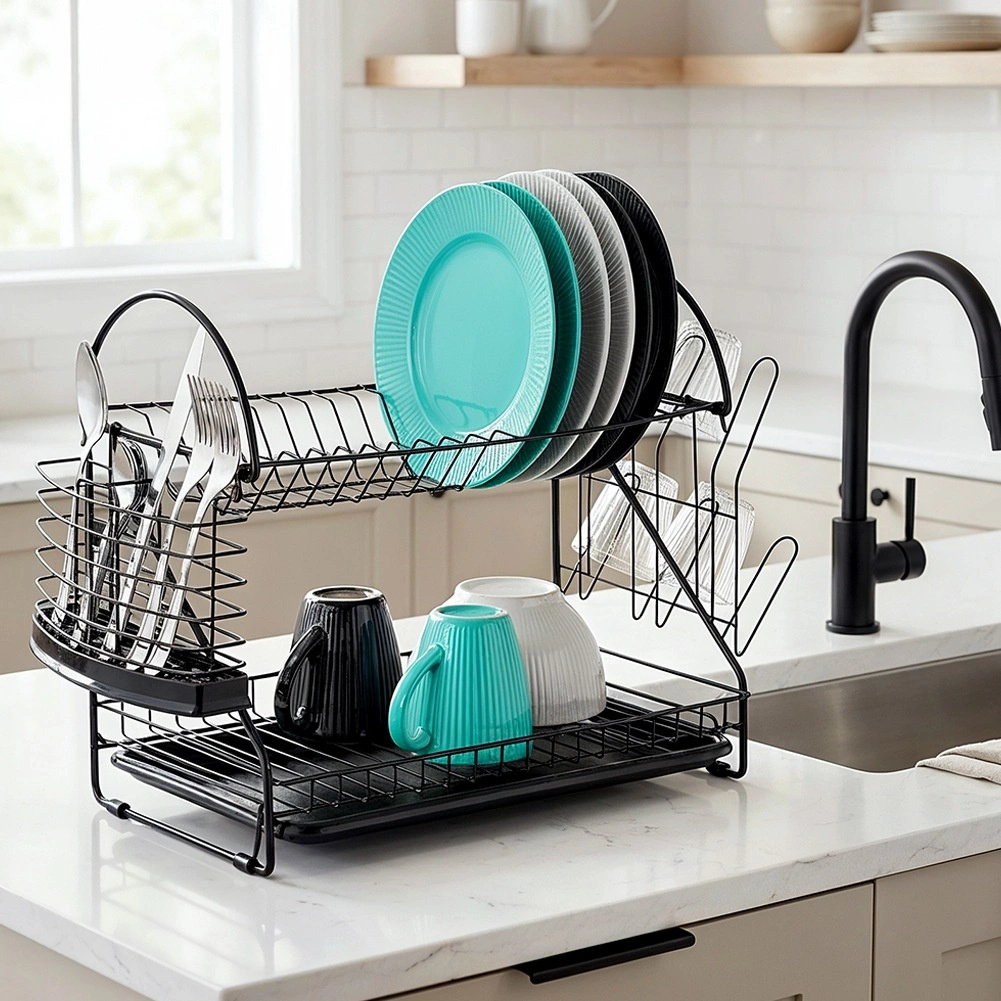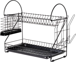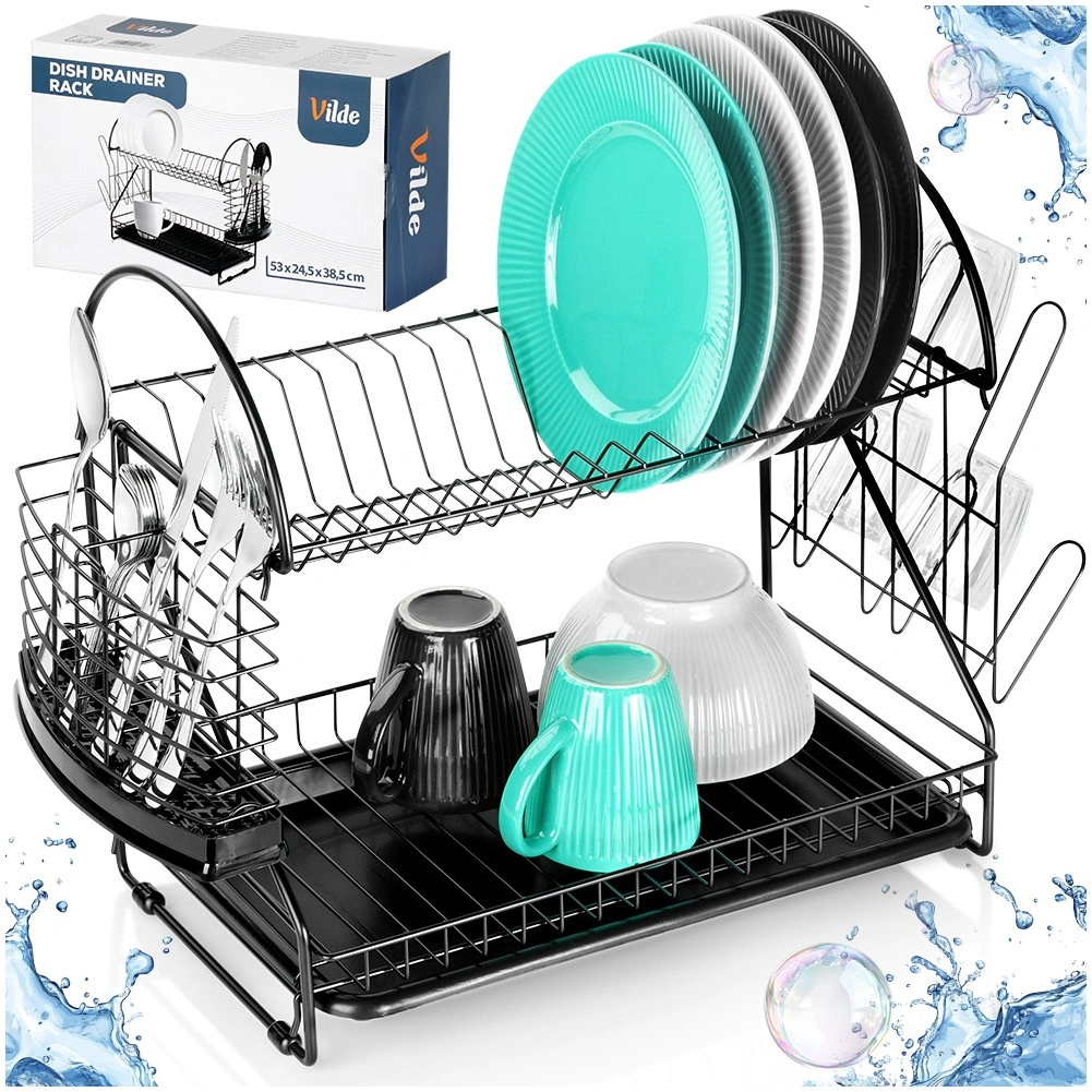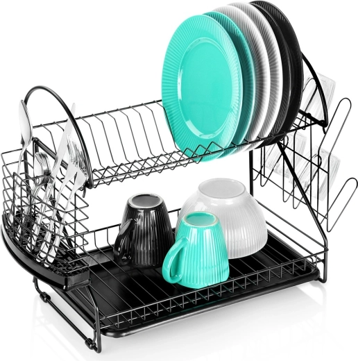 Maximalizujte priestor pri dreze s odkvapkávačom, ktorý kombinuje dve úrovne sušenia, šikovné doplnky a moderný industriálny vzhľad. Robustná kovová konštrukcia v matnej čiernej spolu s vyberateľným plastovým táckom zachytí kvapky a ochráni kuchynskú dosku pred vlhkosťou.