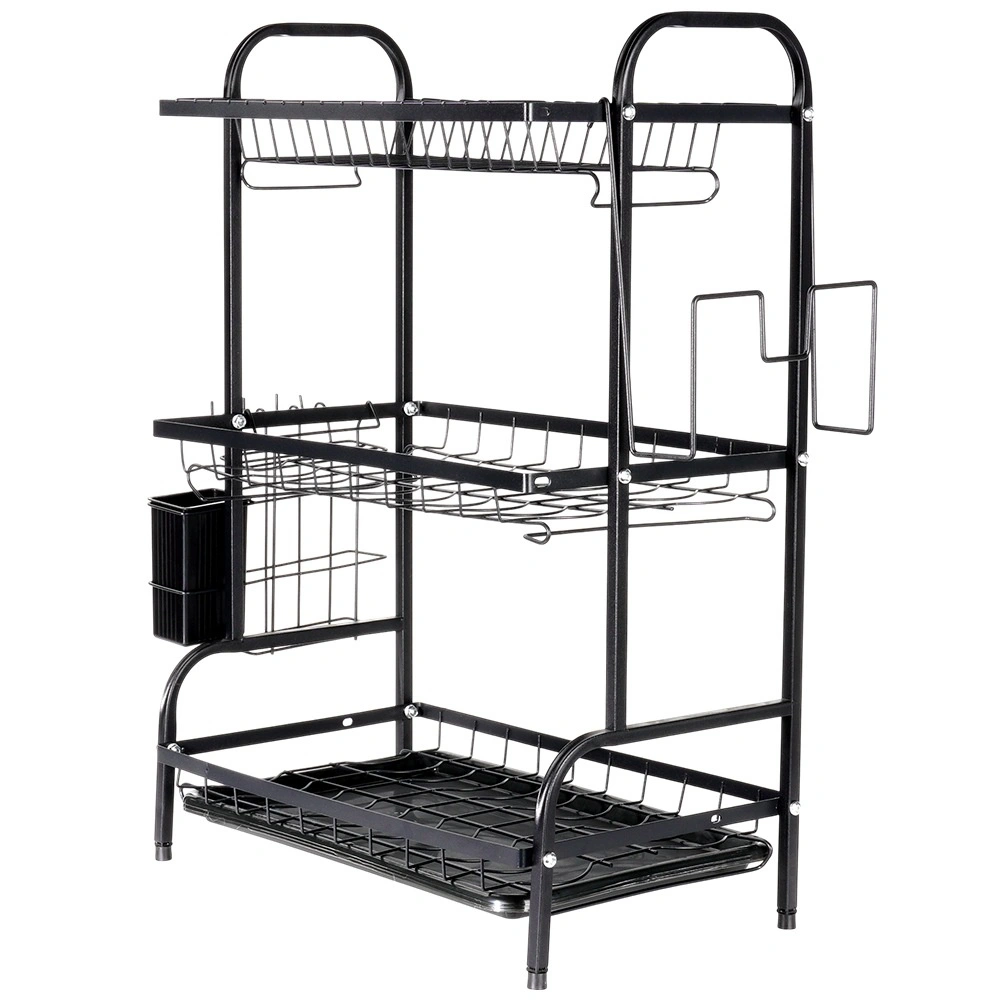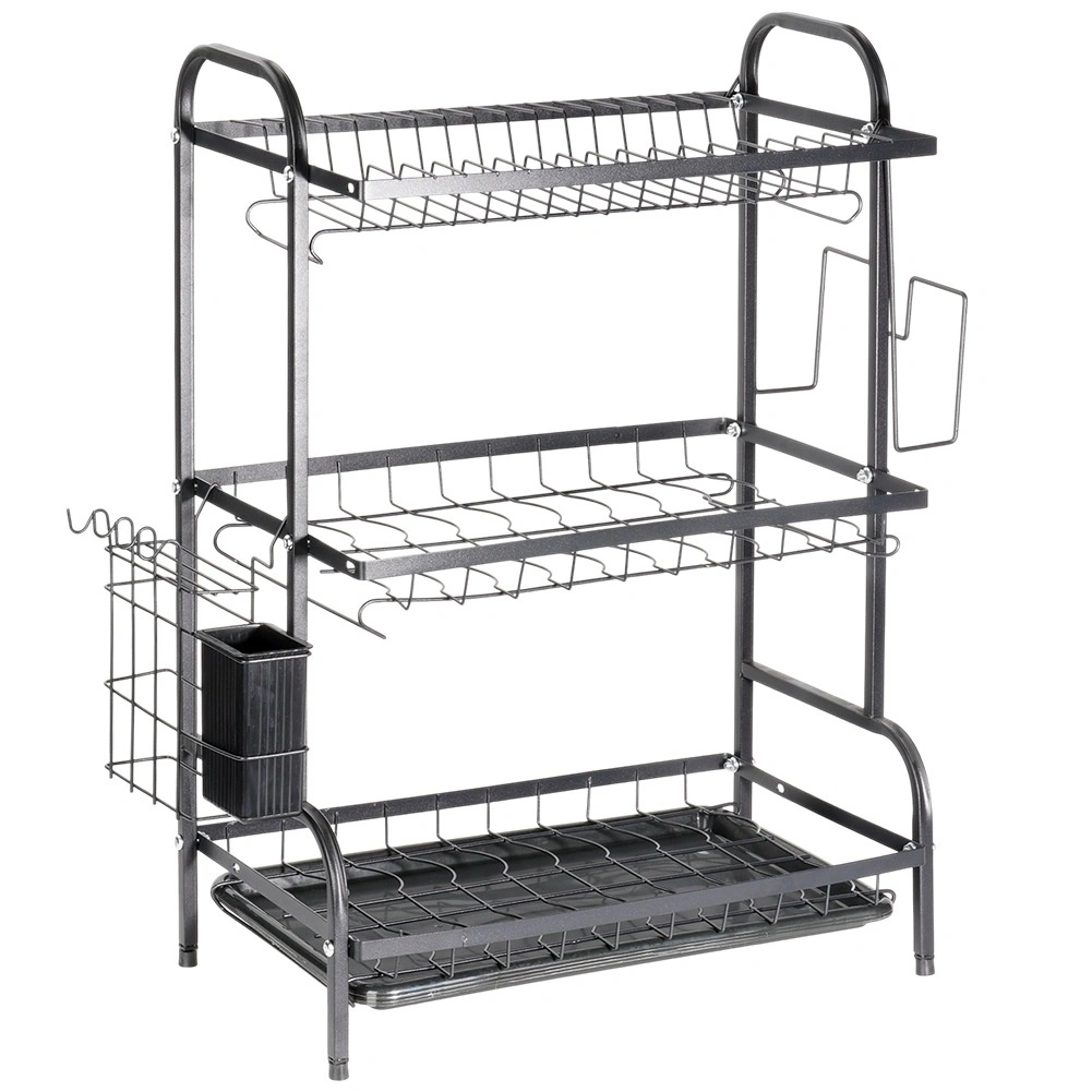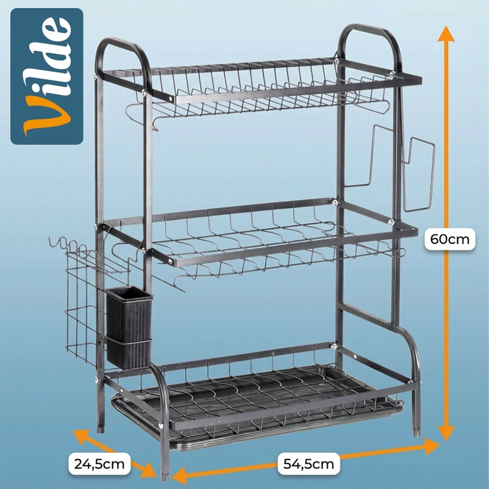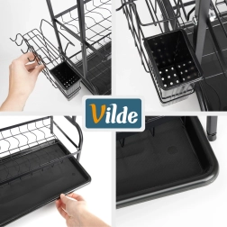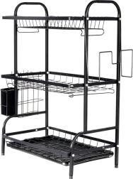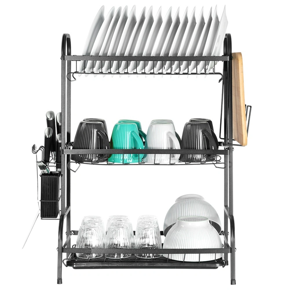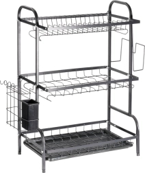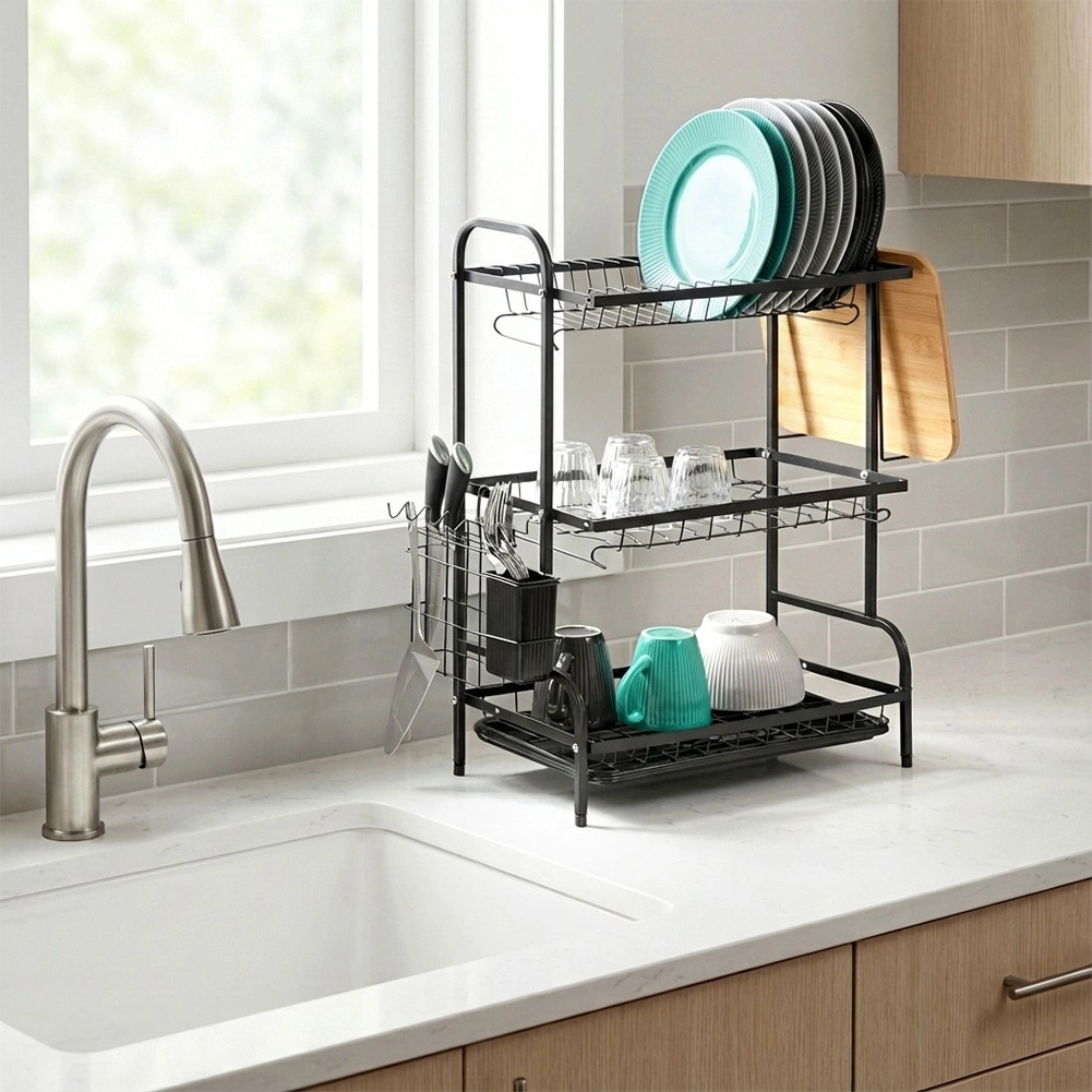 Maximalizujte priestor pri dreze s trojúrovňovým čiernym odkvapkávačom z odolného kovu. Horné poschodie pojme až 16 tanierov, spodné úrovne sú ideálne pre misky, poháre a hrnčeky. Odnímateľný košík na príbory a bočný držiak na dosku na krájanie rozširujú sušiacu plochu, zatiaľ čo vyberateľná odkvapkávacia miska zachytí vodu a udrží dosku suchú.