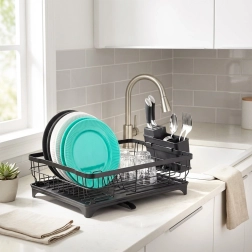 Odkvapkávač na riad kombinuje funkčnosť a štýlový dizajn. Robustná drôtená konštrukcia z nehrdzavejúceho kovu v čiernej farbe a kvalitná plastová odkvapkácia miska sa ľahko čistia a dlho vydržia. Vďaka premyslenému členeniu pojme taniere, poháre aj misky, zatiaľ čo trojkomorový košík udrží príbory prehľadne oddelené.