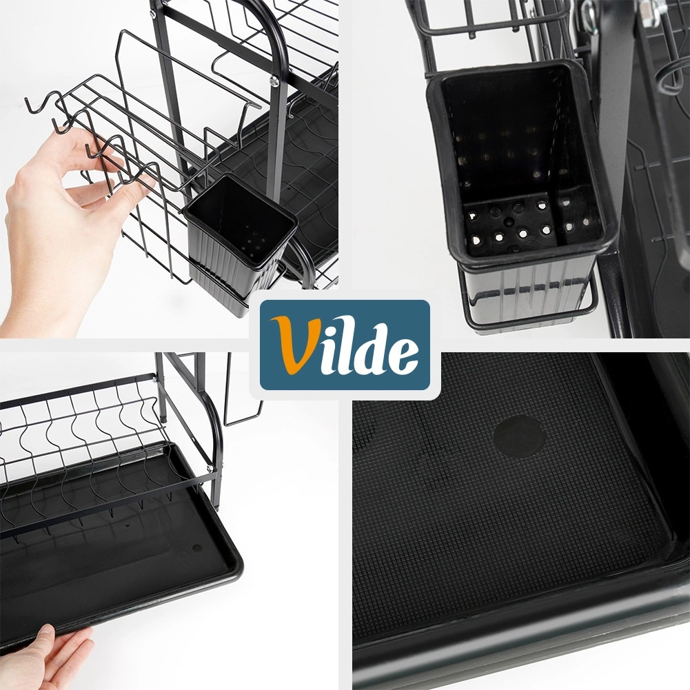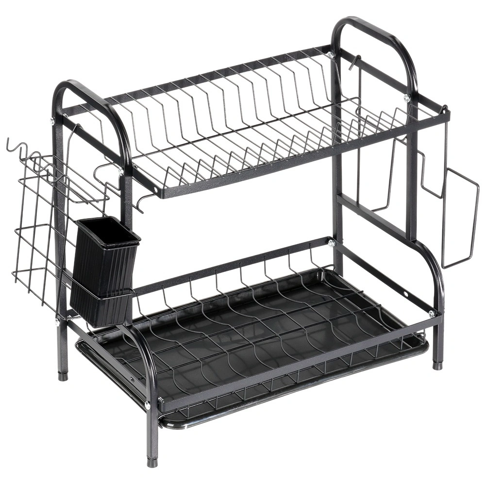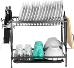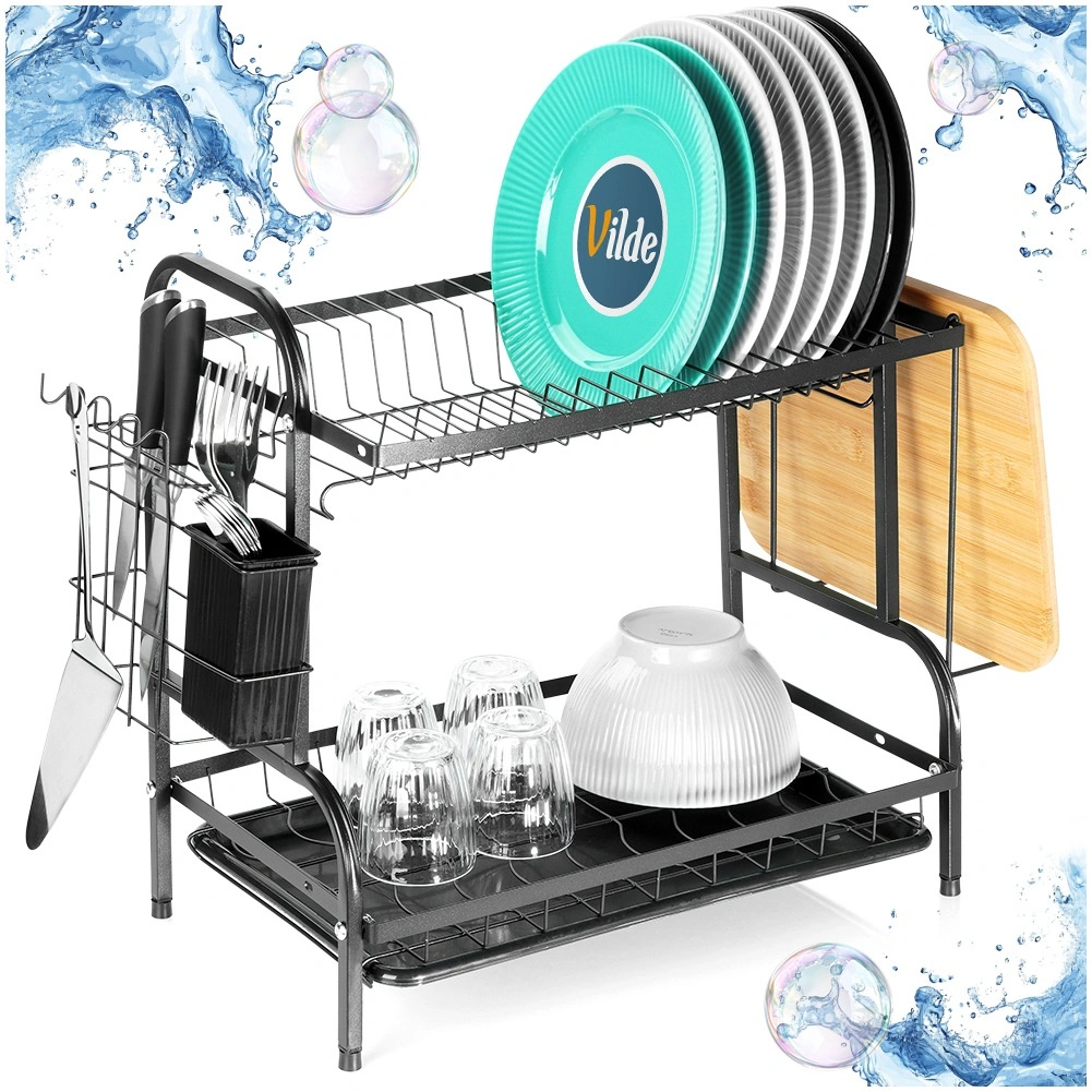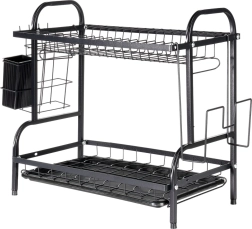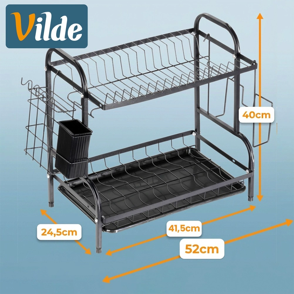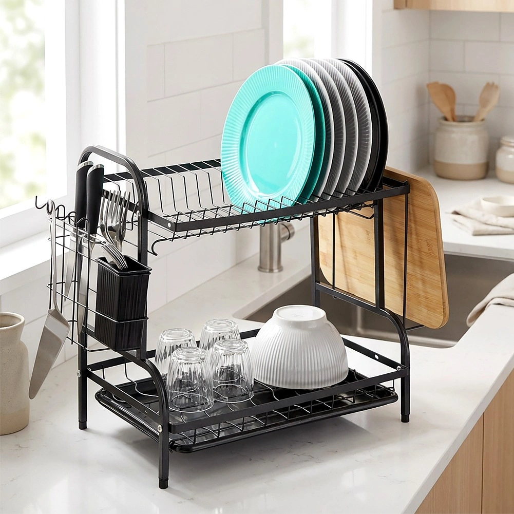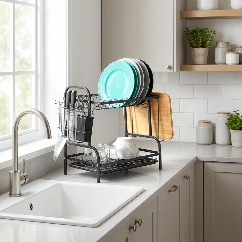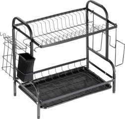 Praktický dvojposchodový odkvapkávač na riad v elegantnej čiernej farbe šetrí miesto na linke a urýchľuje sušenie. Ponúka horný stojan na taniere, spodný priestor pre misky a poháre, bočný držiak na dosku na krájanie a vyberateľný košík na príbory. Vďaka plastovej odkvapkávacej tácke zostane kuchynská doska suchá a čistá. Vyrobené z odolného kovu pre dlhú životnosť a jednoduchú údržbu. Ideálne do moderných aj klasických kuchýň – štýlový loftový dizajn, veľká kapacita a efektívna organizácia každodenného umývania riadu.