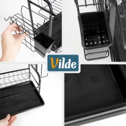 Robustná kovová konštrukcia v matnom čiernom prevedení je odolná a nenáročná na údržbu. Spodná odkvapkávacia tácka z plastu zachytáva vodu a chráni kuchynskú linku pred škvrnami. Celé riešenie je ideálne do menších kuchýň aj domácností, ktoré chcú mať riad vždy prehľadne usporiadaný.