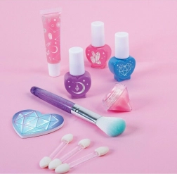 Obsahuje kozmetické puzdro so svetlom a zrkadlom, 12 rôzne farebných očných tieňov, 3 štetce na očné tiene, 2 lícenky, štetec na lícenku, 3 rôzne farebné laky na nechty, lesk na pery, balzam na pery, pilník na nechty a inštrukcie. Vhodné pre deti od 8 rokov.