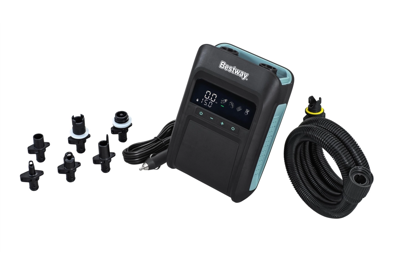 Výkonná elektrická pumpa BESTWAY PowerGrip na 12 V s digitálnym displejom, automatickým vypnutím a max. tlakom 20 PSI rýchlo nafúkne SUP, člny aj rafty. Ponúka dvojitý motor, režimy nízkeho aj vysokého tlaku a presné nastavenie po 0,1 PSI.