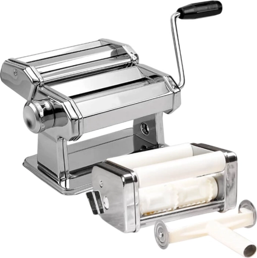 Vďaka funkcii 3v1 pripravíte na jednom zariadení pláty, rezané rezance aj ravioli 4,5 × 4,5 cm. Šírka valcov 14,5 cm zvládne univerzálne použitie a dvojica rezačiek (2 mm a 6,5 mm) pokrýva obľúbené druhy cestovín. Praktická kľučka a možnosť upevnenia k stolovej doske zabezpečujú pohodlné a bezpečné ovládanie.