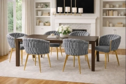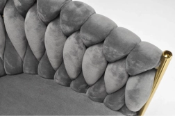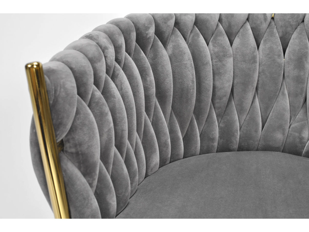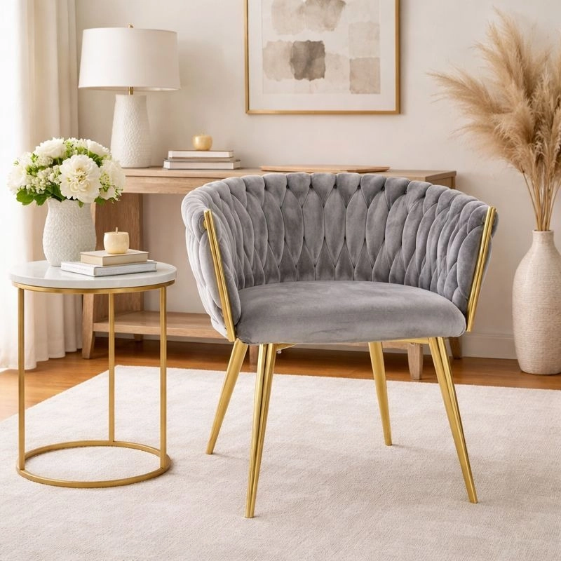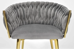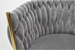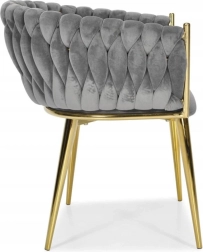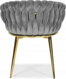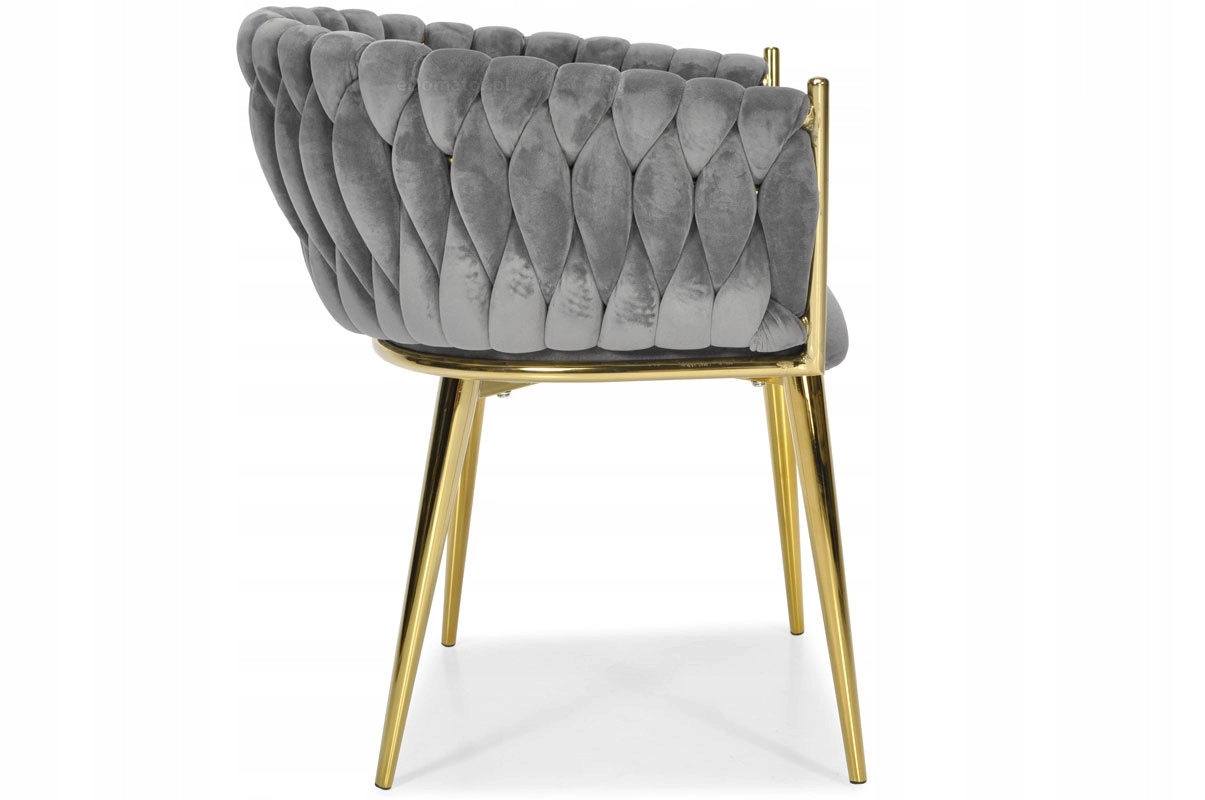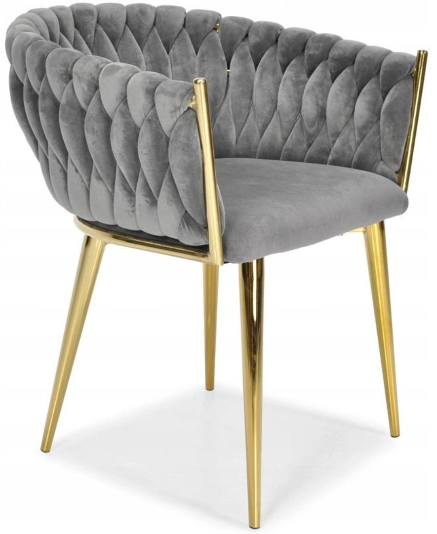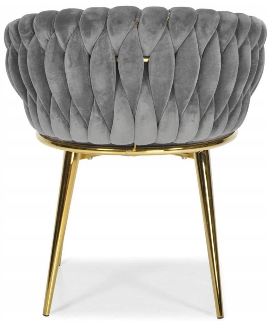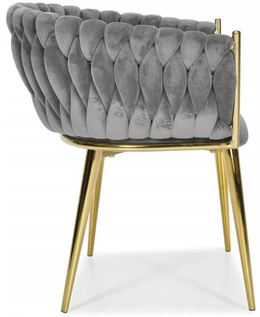 Táto štýlová zamatová stolička prinesie do vášho interiéru okamžitý efekt „wow“. Jemne lesklý zamat v sivom odtieni sa skvele kombinuje so zlatými akcentmi, čiernou, bielou aj prírodným drevom. Prepletané 3D čalúnenie operadla dodáva luxusný vzhľad a robí zo stoličky dizajnovú dominantu jedálne, obývačky či toaletného kúta.