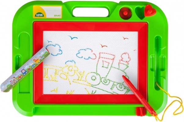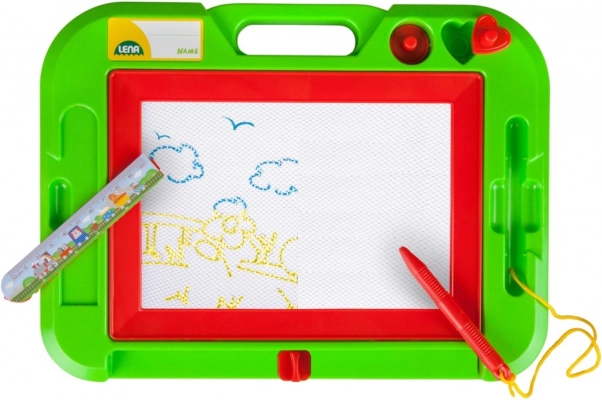Detská magnetická kresliaca tabuľka od značky LENA podporuje kreativitu a jemnú motoriku. Súčasťou je pero na šnúrke, 2 magnetické pečiatky a lišta na rýchle mazanie, vďaka ktorej deti ľahko začnú znova kresliť. Pri písaní kovovým hrotom sa farebná plocha mení a vytvára živé obrázky.