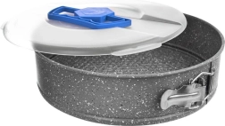Táto okrúhla rozkladacia forma s vekom je ideálna na pečenie tort, cheesecakov a studených dezertov. Robustná oceľ s granitovým nepriľnavým povrchom zabraňuje pripaľovaniu a uľahčuje čistenie. Priesvitné veko s modrým sklápacím madlom umožňuje bezpečné skladovanie a pohodlné prenášanie.