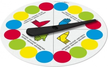 Spinner so štyrmi farbami a inštrukciami určuje, kam položiť ruku alebo nohu. Každé roztočenie prináša novú úlohu a viac smiechu.