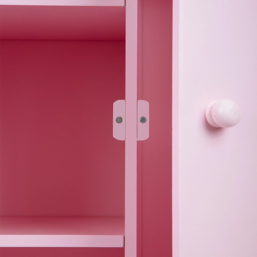 Táto kvalitná drevená skrinka v jemnej ružovej farbe je ideálna na prehľadné uloženie oblečenia a doplnkov vašich bábik. Ľavá časť ponúka dve praktické police, pravá strana je vybavená závesnou tyčou na šatočky. Dvierka s magnetickým zatváraním sa ľahko ovládajú a výrezy hviezdy a mesiaca dodávajú nábytku pôvabný vzhľad.